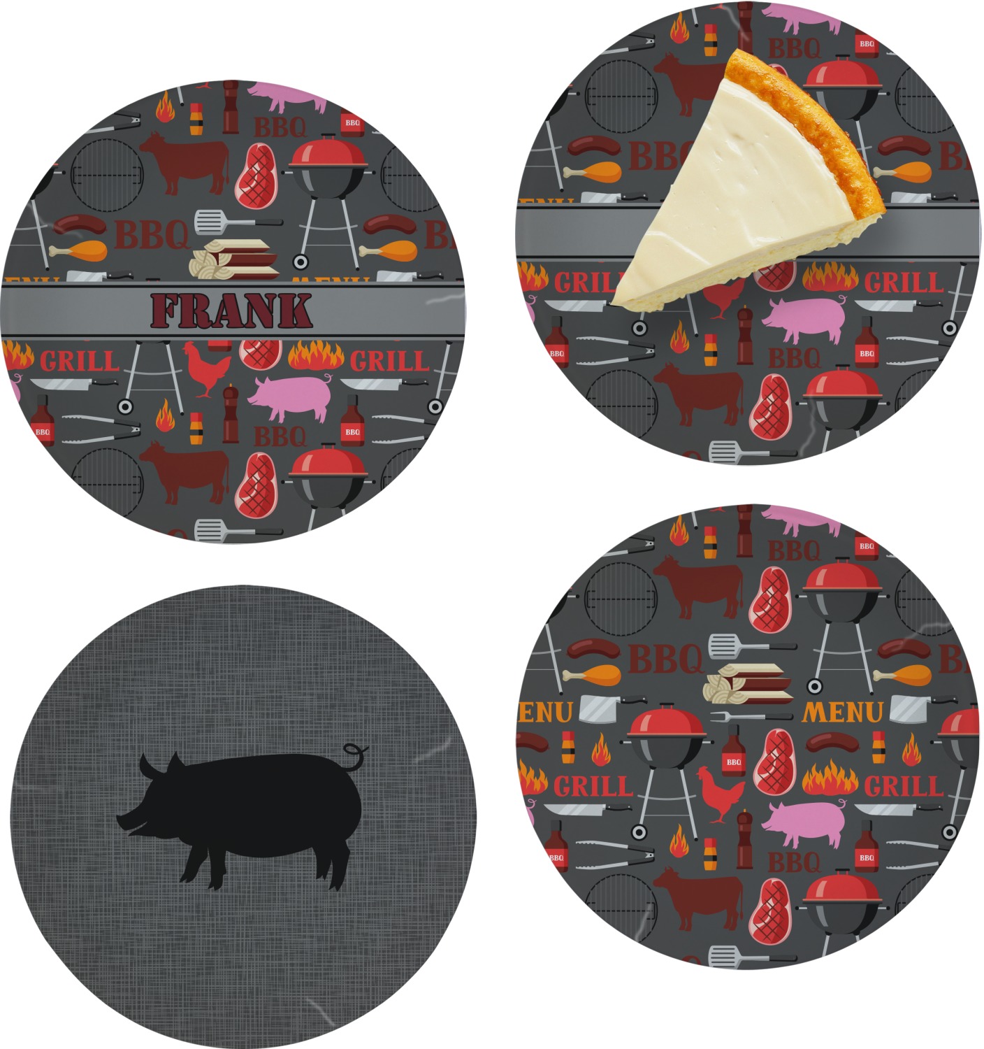 This design features pigs, cows, grills, and more on a simple grey background. There are wonderful contrasting reds, oranges, and charcoals in this manly design. The ribbon across the middle fits your personalization right in the middle.