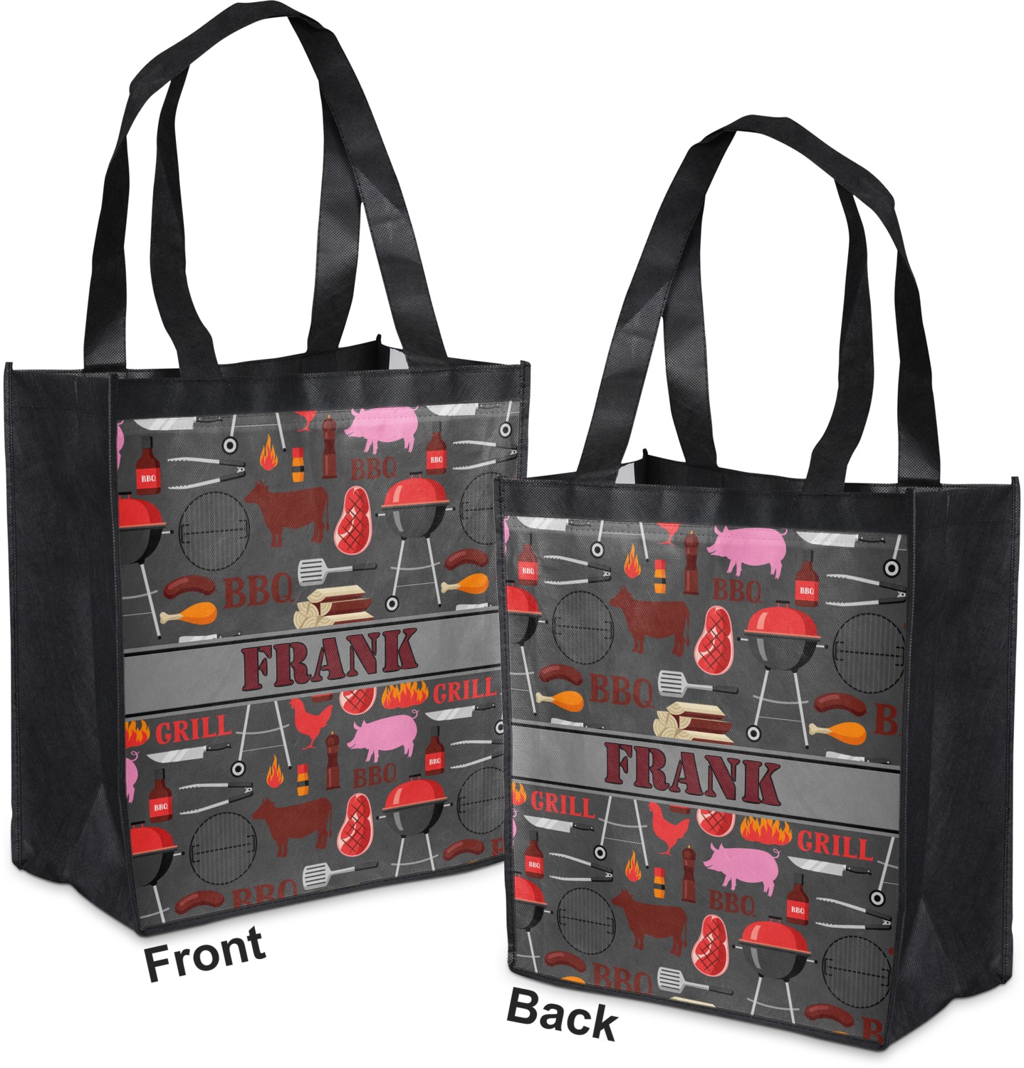 Made from a durable, biodegradable material, these reusable shopping bags can support up to 30 pounds of weight. With two large handles, measuring at 8.5 inches each, these personalized tote bags are easy to carry to your vehicle or home. The bag itself is 12 by 13.5 inches, and can expand to a depth of 7 inches. Your customization is printed on both the front and back, while the remaining sides, trim, and handle are a sleek, charcoal black.