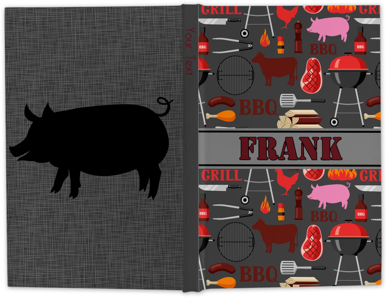 This design features pigs, cows, grills, and more on a simple grey background. There are wonderful contrasting reds, oranges, and charcoals in this manly design. The ribbon across the middle fits your personalization right in the middle.