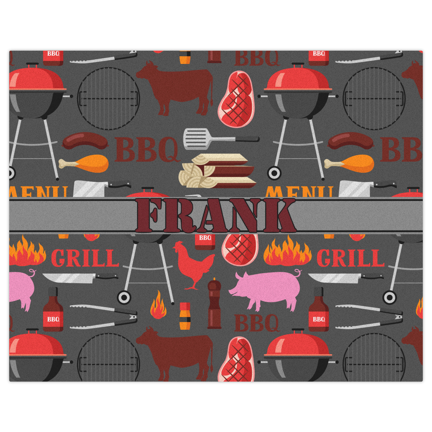 This design features pigs, cows, grills, and more on a simple grey background. There are wonderful contrasting reds, oranges, and charcoals in this manly design. The ribbon across the middle fits your personalization right in the middle.