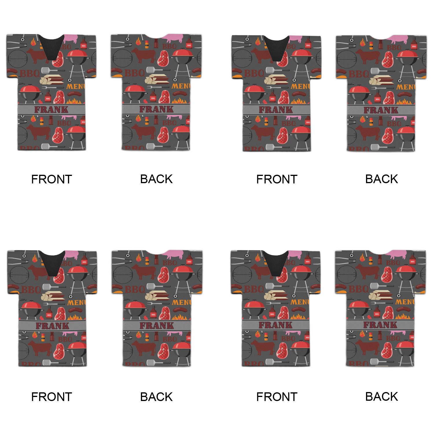 This design features pigs, cows, grills, and more on a simple grey background. There are wonderful contrasting reds, oranges, and charcoals in this manly design. The ribbon across the middle fits your personalization right in the middle.