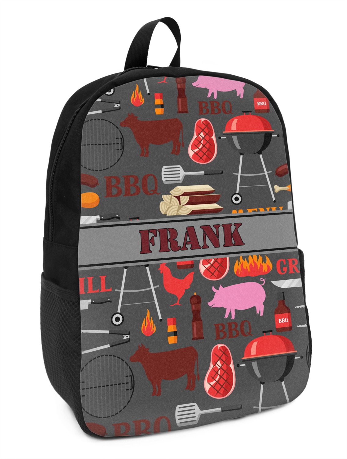 These small backpacks are made of a durable black canvas material with your personalization right on the front. The two shoulder straps are padded and easily adjustable. The bag itself measures at about 11" W x 15" H x 5" D. It's the perfect size for elementary aged kids or adults who want a smaller backpack. On the top of the bag you will find a handle to hang or carry your backpack by as well as a large zipper closure to keep all of your belongings safe inside. On each side of your backpack is a mesh pocket for a small item or water bottle. Inside your backpack you will find a spacious area with a small zipper pocket and a padded laptop slot that will fit up to a 13" laptop (13" being very snug). This is the perfect bag for any student that needs a couple books and their laptop with them at all times. It also works great as a carry on for traveling!