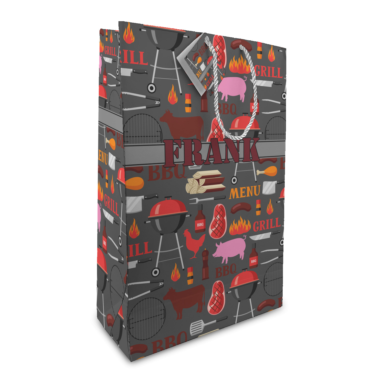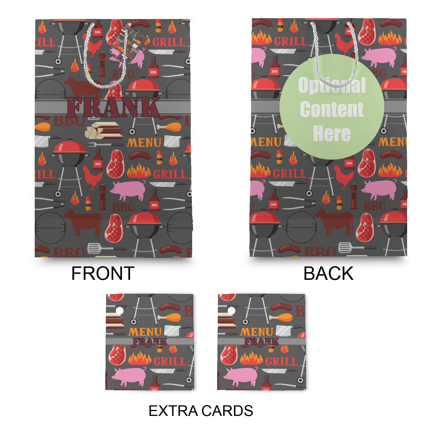 This design features pigs, cows, grills, and more on a simple grey background. There are wonderful contrasting reds, oranges, and charcoals in this manly design. The ribbon across the middle fits your personalization right in the middle.