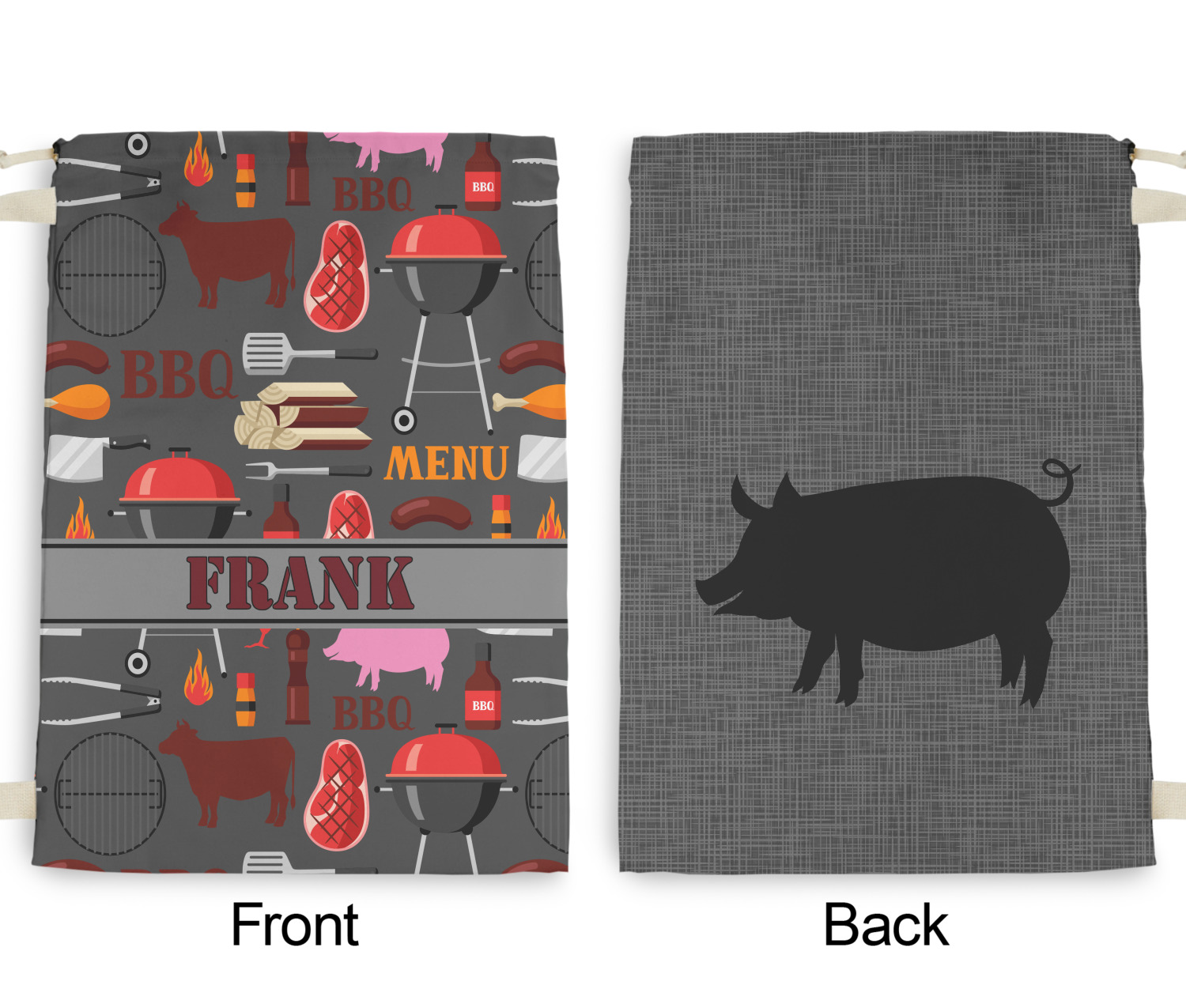 This design features pigs, cows, grills, and more on a simple grey background. There are wonderful contrasting reds, oranges, and charcoals in this manly design. The ribbon across the middle fits your personalization right in the middle.