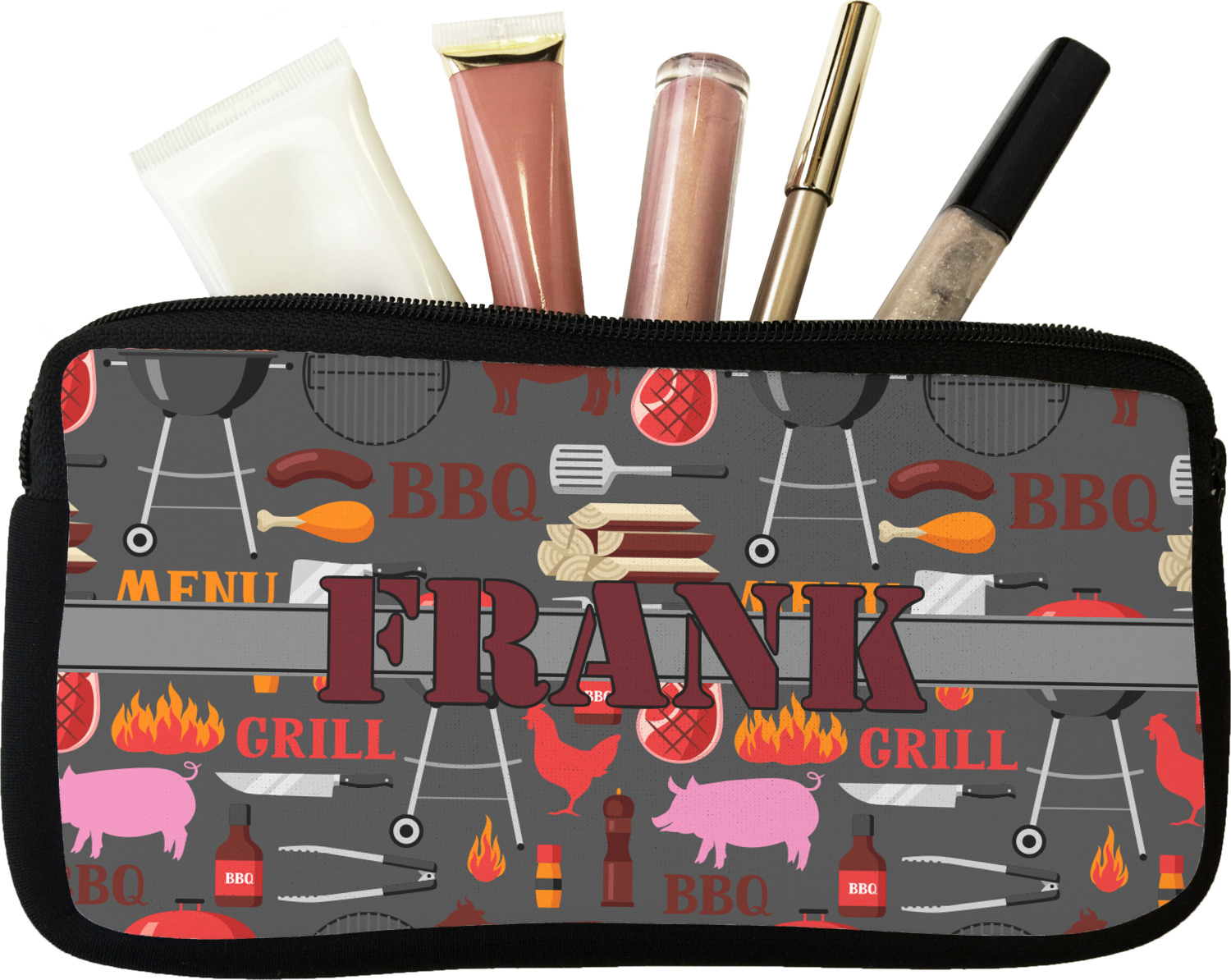 Our personalized makeup bags are available in many different designs, patterns and colors - so you are sure to find one that will love. They are made of neoprene (same material as wet-suits) and thus are water resistant, so spillages in your makeup bag will not end up all over you purse. They are customized on one side and are black on the other side and the zipper is black as well.