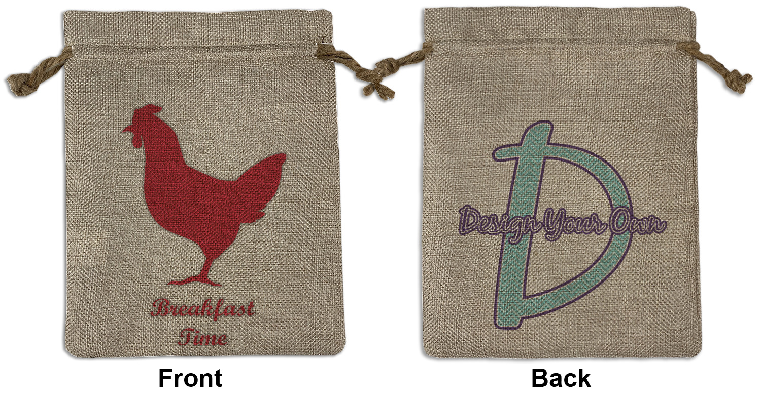 We sell our Burlap Gift Bags in 3 variant sized bags. Made with burlap polyester, each personalized bag can be secured with a twine drawstring pull. Your custom design is available to print on one side or both sides - completely up to you! The sizes of the bags measure approximately 4.5" x 6.5" for the smallest size, 6.5" x 8.0" for the medium size, and 6.5" x 13.5" for the large-sized bag.
