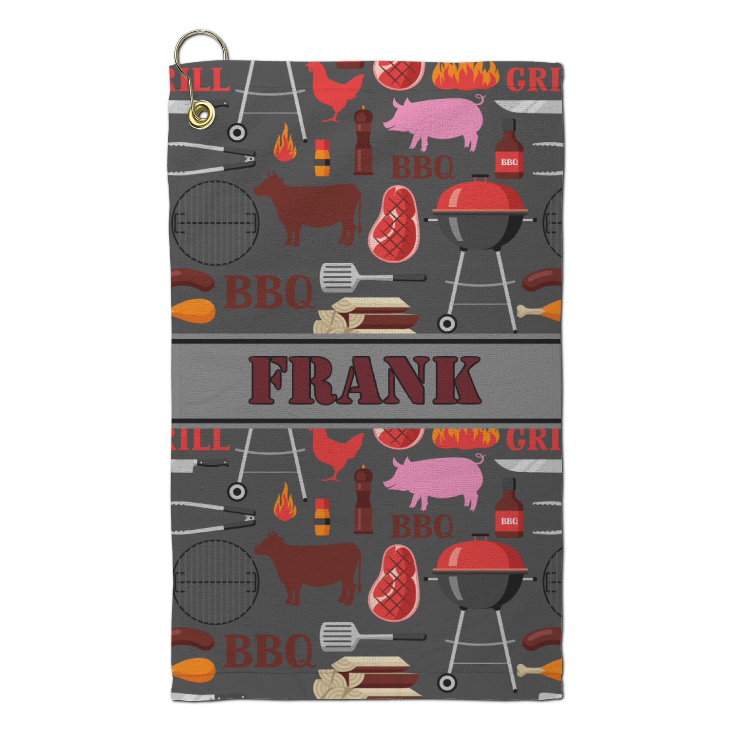 This design features pigs, cows, grills, and more on a simple grey background. There are wonderful contrasting reds, oranges, and charcoals in this manly design. The ribbon across the middle fits your personalization right in the middle.