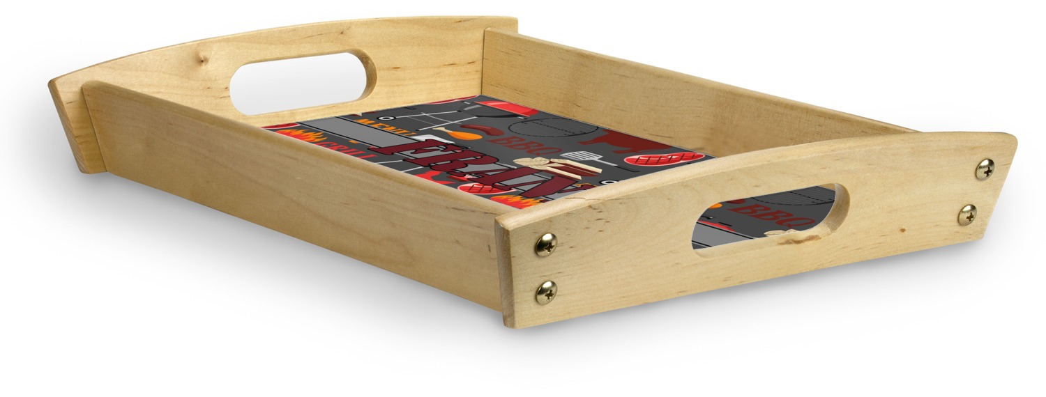 This serving tray with handles features square edges and two rounded sides, creating a very modern look. Each side is fabricated from a beautifully cut, natural wood. The bottom of the interior of the tray displays your customized design in bright, vibrant color. The tray is sold in both a black color and a natural wood look. Each variation of the wood serving tray has two sizes: Small, which is 14" x 10" x 2.25", and Large, which is 19.5" x 13.5" x 2.75".