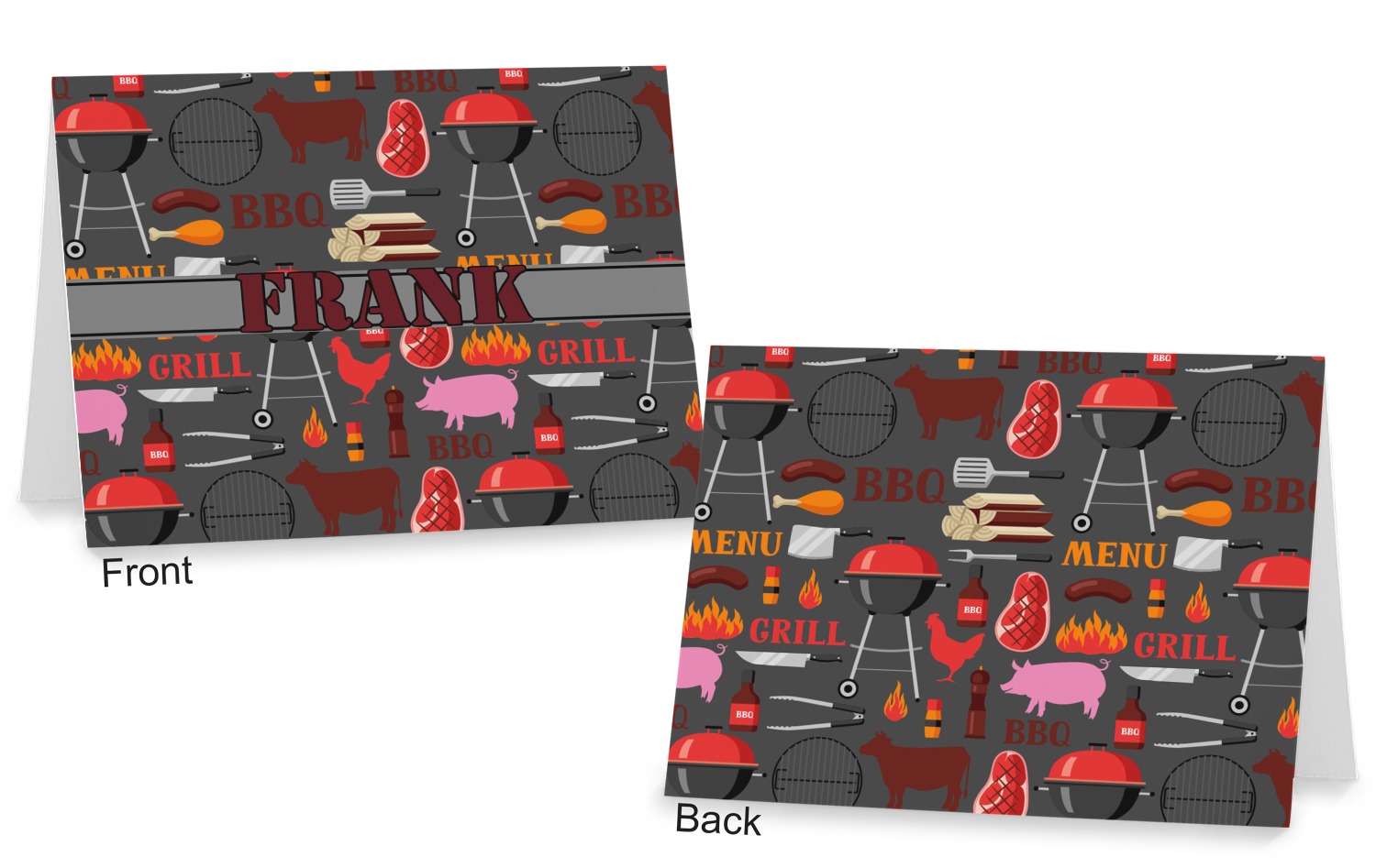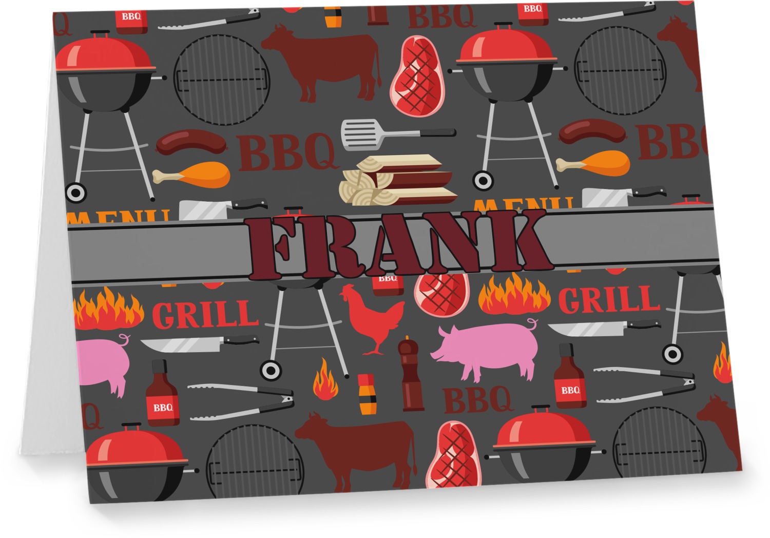 This design features pigs, cows, grills, and more on a simple grey background. There are wonderful contrasting reds, oranges, and charcoals in this manly design. The ribbon across the middle fits your personalization right in the middle.