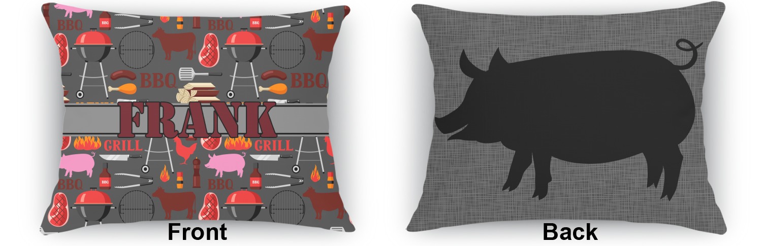 This design features pigs, cows, grills, and more on a simple grey background. There are wonderful contrasting reds, oranges, and charcoals in this manly design. The ribbon across the middle fits your personalization right in the middle.
