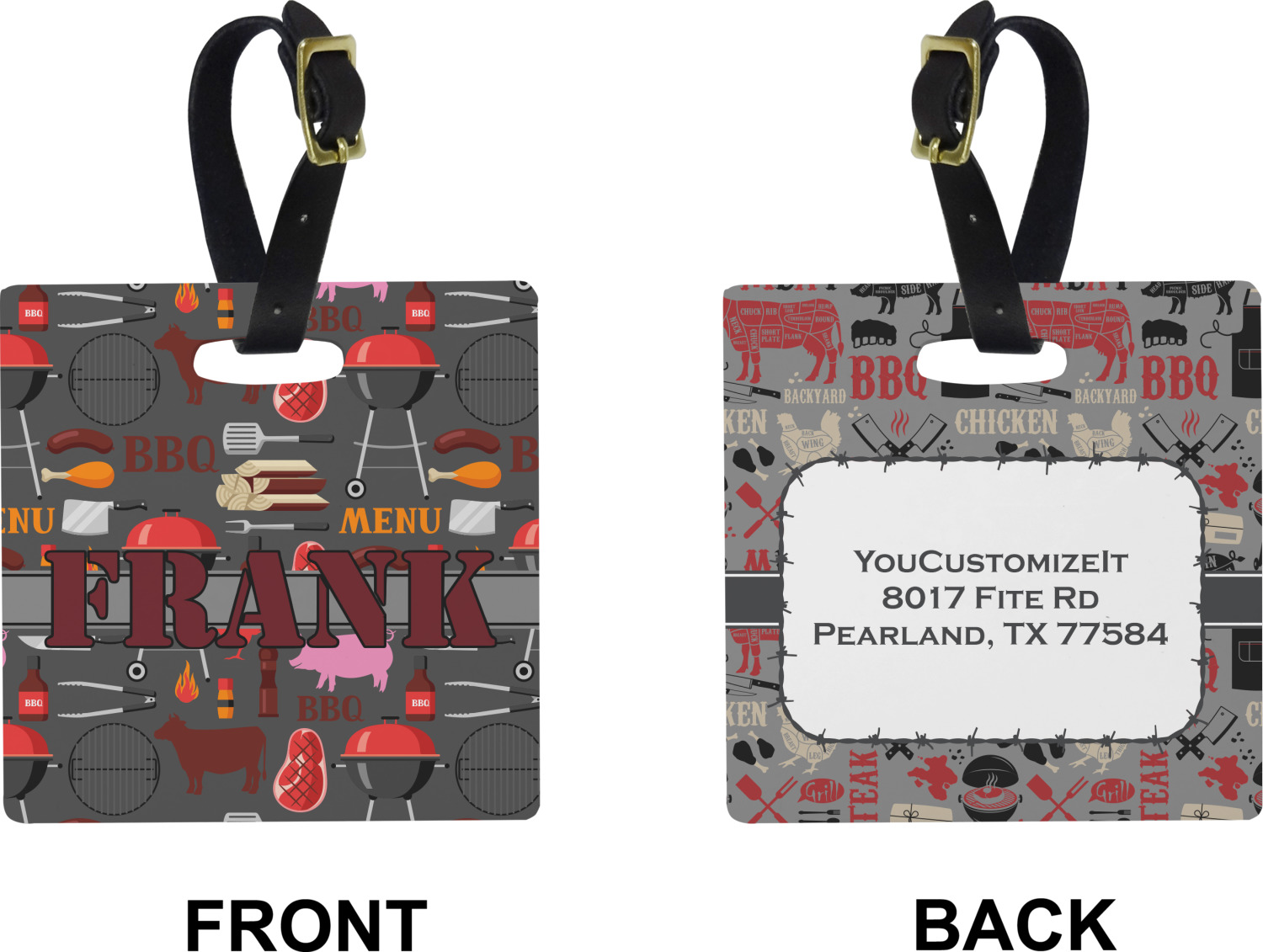 These personalized bag tags are sold in a variety of shapes, so that you may find the product that meets your vision exactly. We sell a round luggage tag, which measures at approximately 4" x 4". Our square luggage tag is about 3.5" x 3.5", while our rectangular version is 2.75" x 4 ".