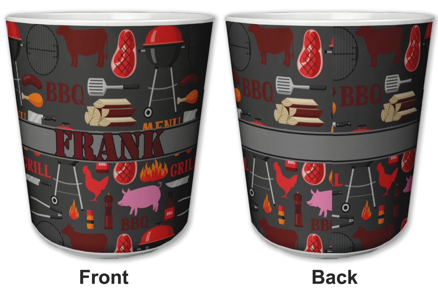 This design features pigs, cows, grills, and more on a simple grey background. There are wonderful contrasting reds, oranges, and charcoals in this manly design. The ribbon across the middle fits your personalization right in the middle.
