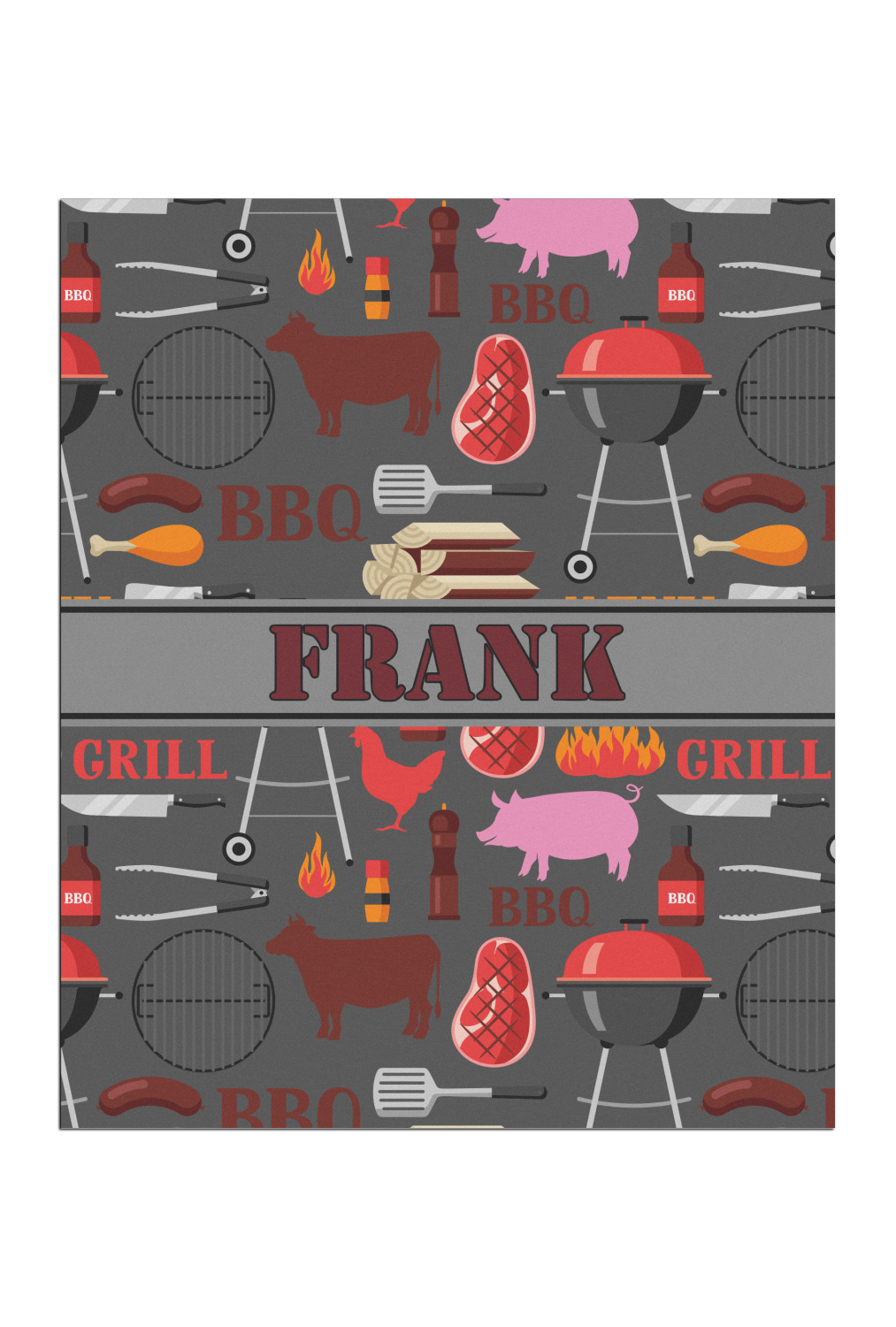 This design features pigs, cows, grills, and more on a simple grey background. There are wonderful contrasting reds, oranges, and charcoals in this manly design. The ribbon across the middle fits your personalization right in the middle.