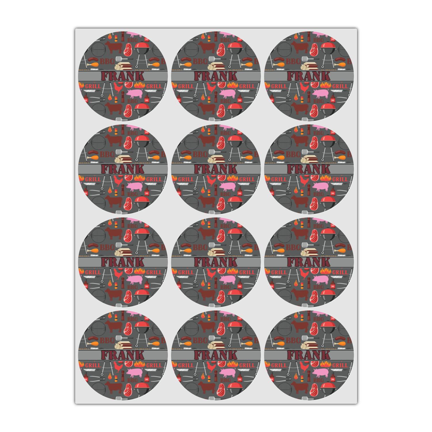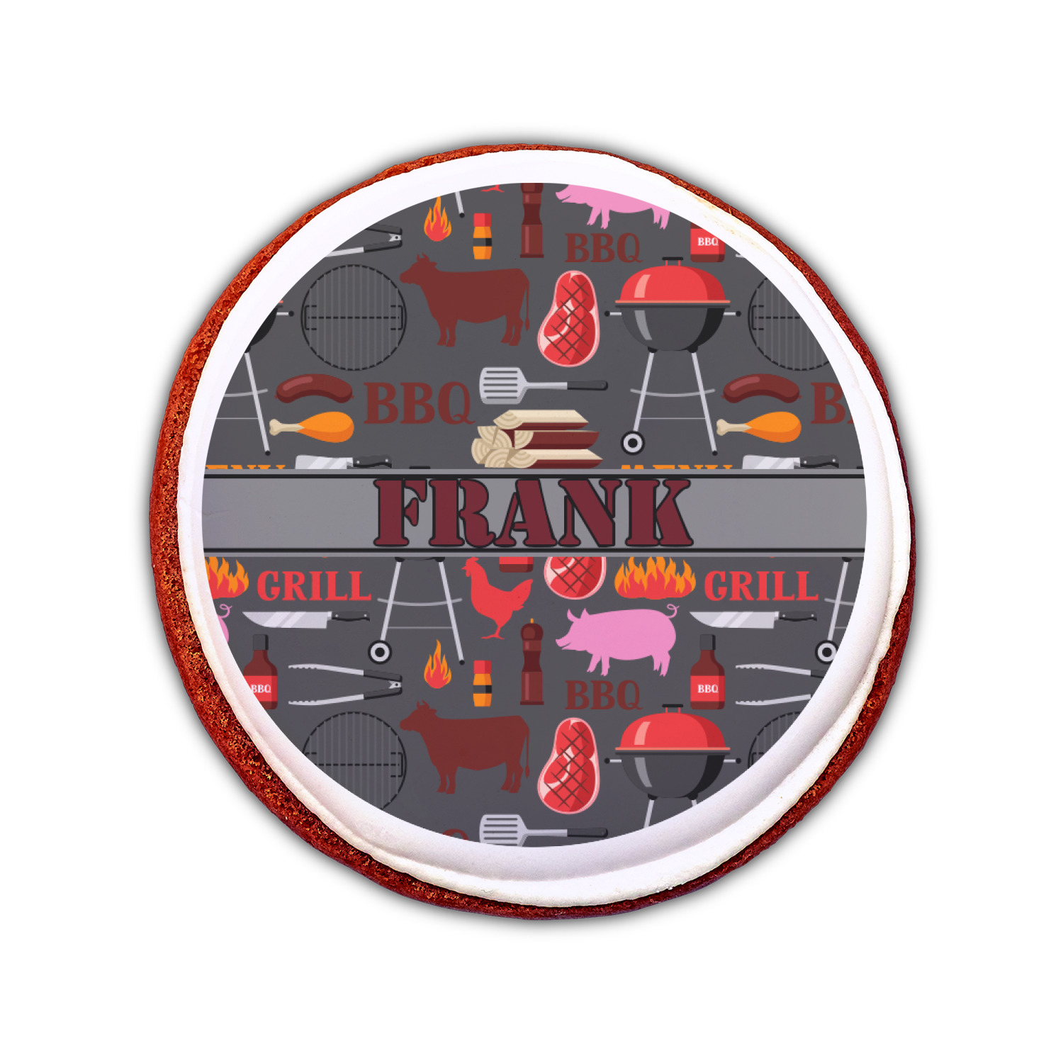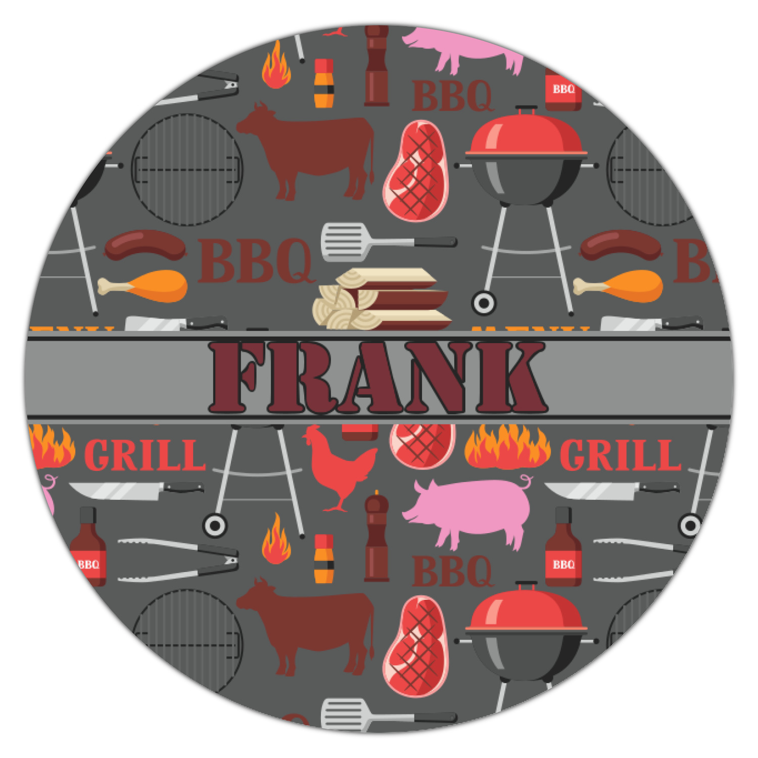 This design features pigs, cows, grills, and more on a simple grey background. There are wonderful contrasting reds, oranges, and charcoals in this manly design. The ribbon across the middle fits your personalization right in the middle.