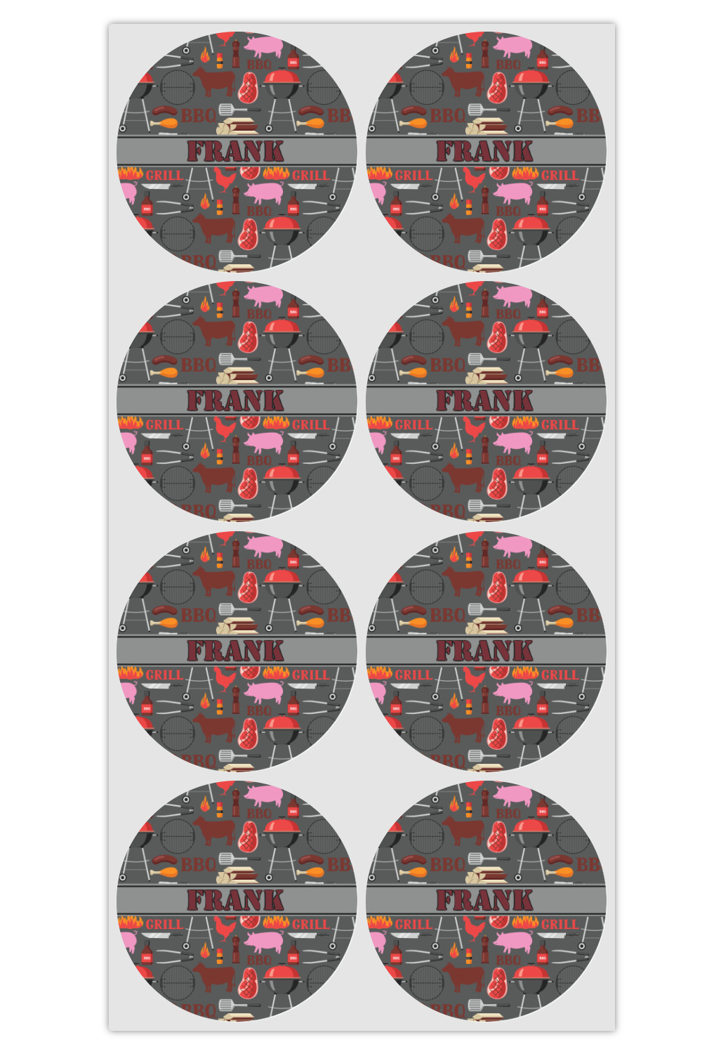This design features pigs, cows, grills, and more on a simple grey background. There are wonderful contrasting reds, oranges, and charcoals in this manly design. The ribbon across the middle fits your personalization right in the middle.