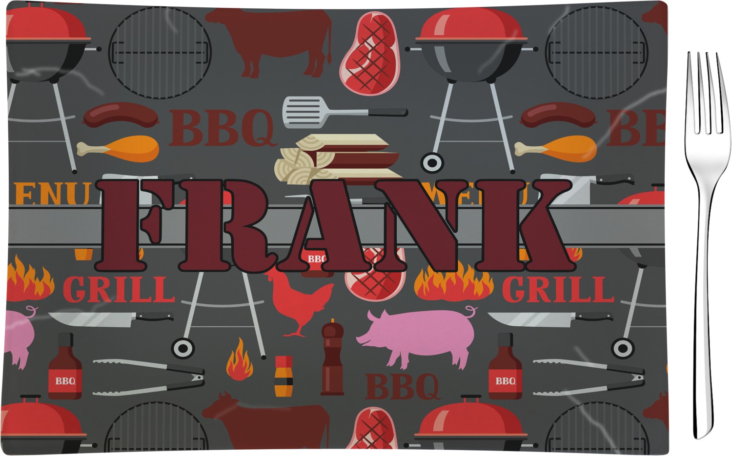 This design features pigs, cows, grills, and more on a simple grey background. There are wonderful contrasting reds, oranges, and charcoals in this manly design. The ribbon across the middle fits your personalization right in the middle.