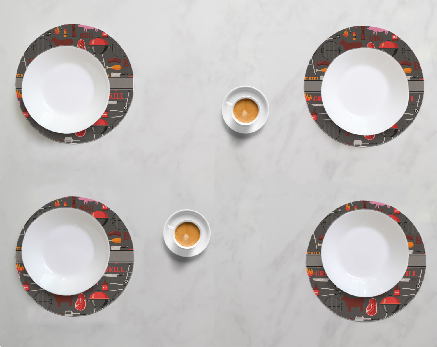 This design features pigs, cows, grills, and more on a simple grey background. There are wonderful contrasting reds, oranges, and charcoals in this manly design. The ribbon across the middle fits your personalization right in the middle.