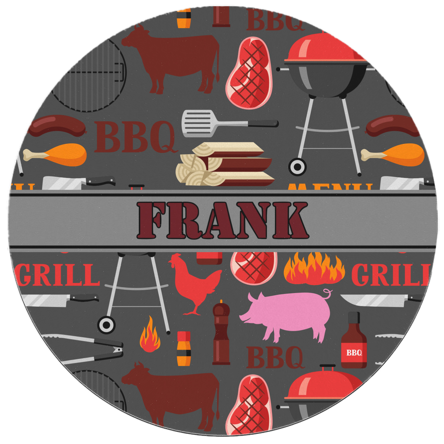 This design features pigs, cows, grills, and more on a simple grey background. There are wonderful contrasting reds, oranges, and charcoals in this manly design. The ribbon across the middle fits your personalization right in the middle.
