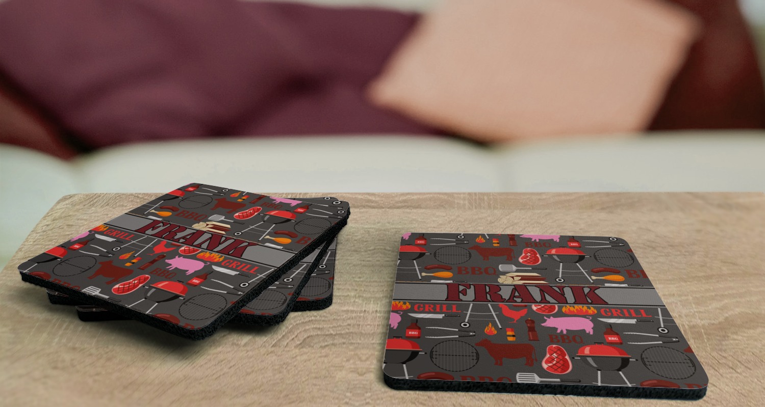 These drink coasters have a smooth, polyester top and a textured, rubber backing on its bottom. The non-slip rubber backing underneath works to keep any spills at bay. At 4 by 4 by 0.25 inches thick, these custom coasters are a suitable size for most drinkware. Your personalization is displayed atop the face of the cup coaster. We sell these rubber coasters in two different shapes: square and round. You can buy each shape as singulars or as a set of 4.