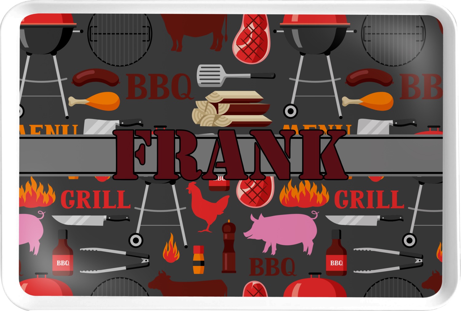 This design features pigs, cows, grills, and more on a simple grey background. There are wonderful contrasting reds, oranges, and charcoals in this manly design. The ribbon across the middle fits your personalization right in the middle.