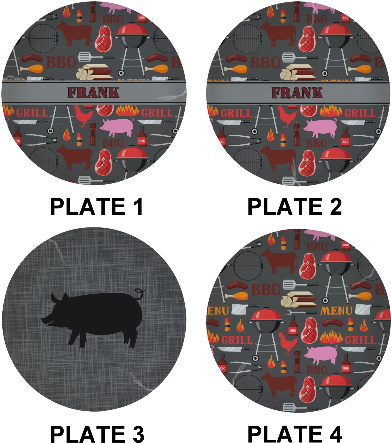 This design features pigs, cows, grills, and more on a simple grey background. There are wonderful contrasting reds, oranges, and charcoals in this manly design. The ribbon across the middle fits your personalization right in the middle.