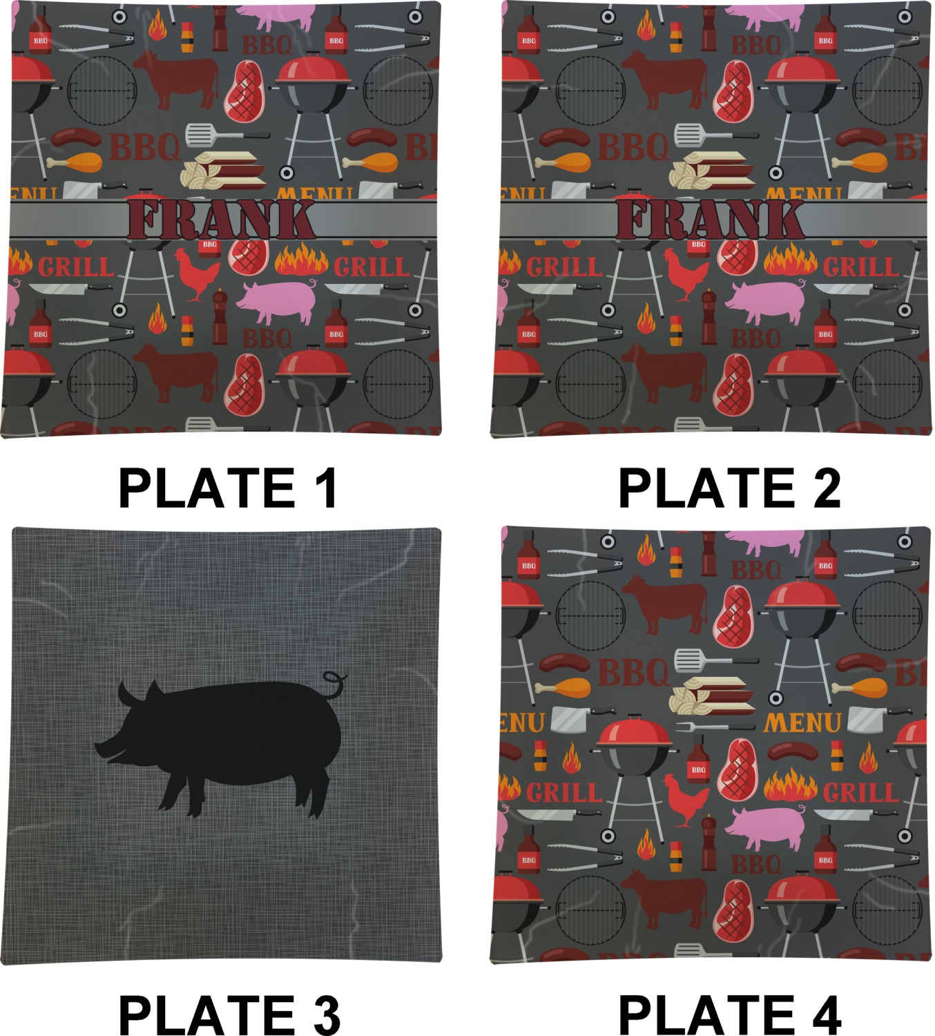 This design features pigs, cows, grills, and more on a simple grey background. There are wonderful contrasting reds, oranges, and charcoals in this manly design. The ribbon across the middle fits your personalization right in the middle.