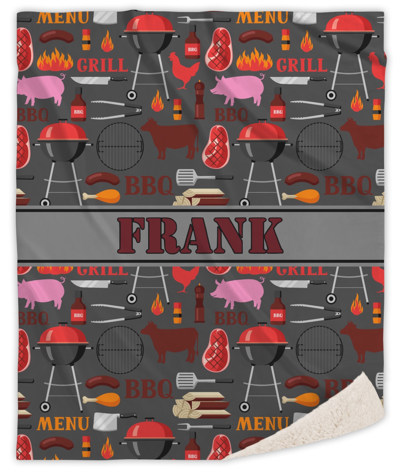 This design features pigs, cows, grills, and more on a simple grey background. There are wonderful contrasting reds, oranges, and charcoals in this manly design. The ribbon across the middle fits your personalization right in the middle.