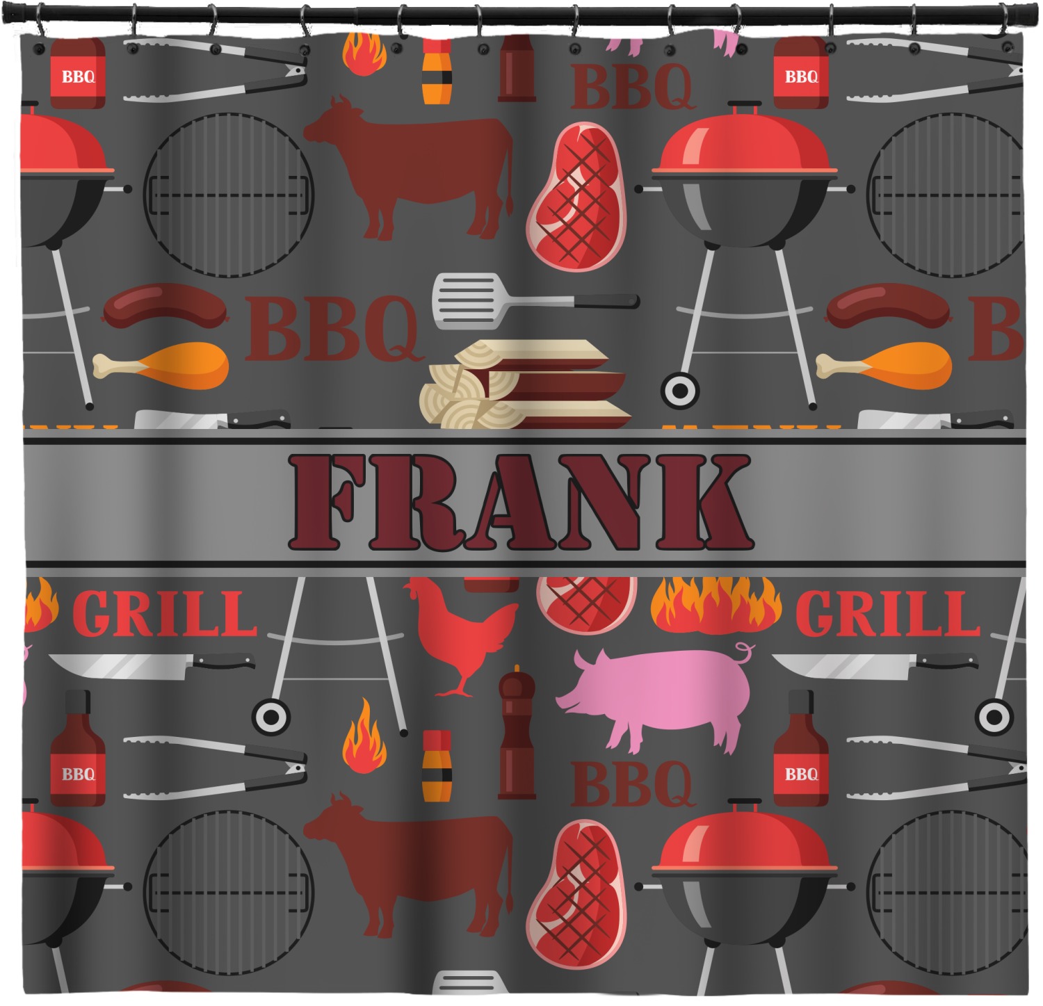 This design features pigs, cows, grills, and more on a simple grey background. There are wonderful contrasting reds, oranges, and charcoals in this manly design. The ribbon across the middle fits your personalization right in the middle.