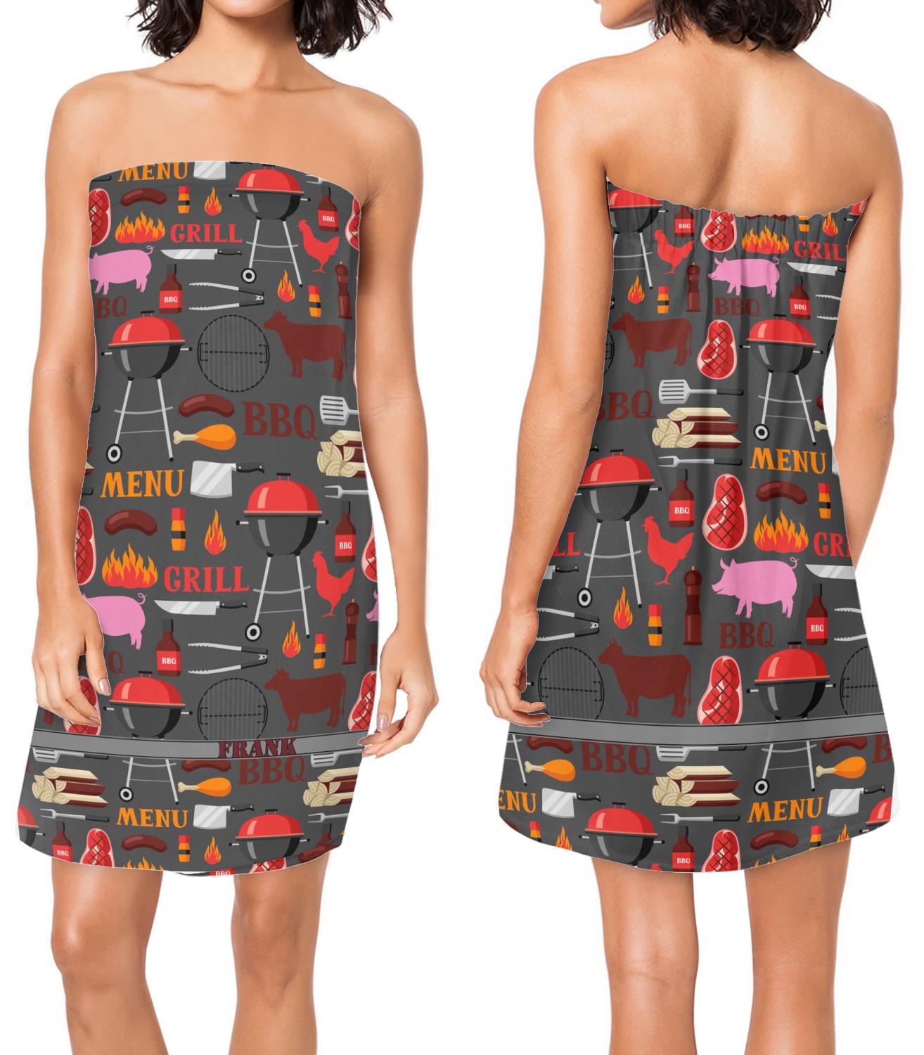 This design features pigs, cows, grills, and more on a simple grey background. There are wonderful contrasting reds, oranges, and charcoals in this manly design. The ribbon across the middle fits your personalization right in the middle.