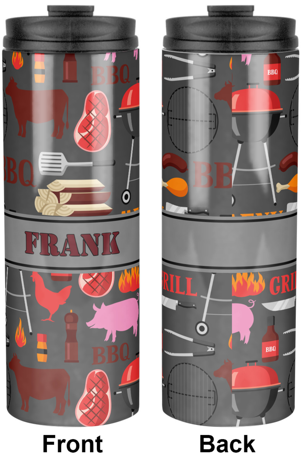 This design features pigs, cows, grills, and more on a simple grey background. There are wonderful contrasting reds, oranges, and charcoals in this manly design. The ribbon across the middle fits your personalization right in the middle.