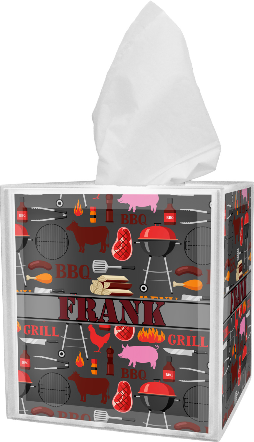 These tissue holders are built from durable acrylic and display your unique personalization on fine-quality vinyl inserts placed within the four sides and top. The box features two pieces, allowing you to easily switch out tissue boxes. On the sides, youll find ridges that ensure the top and base fit securely in place. The bottom of these tissue box holders has four, rubber, non-slip pads to prevent the box from scuffing any surface you decide to display it on. Each box can fit a standard 5 by 5-inch box of tissues.