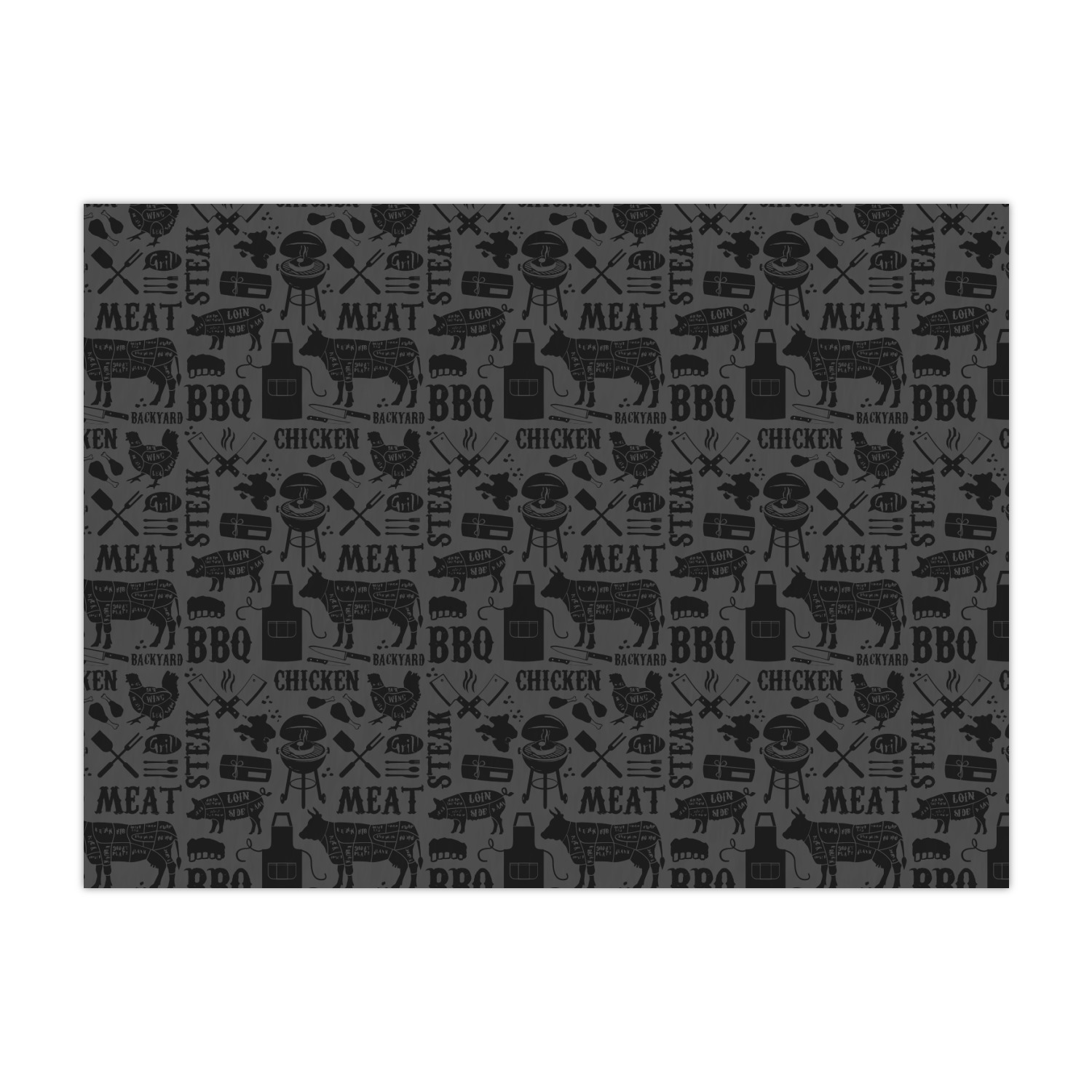 This design features pigs, cows, grills, and more on a simple grey background. There are wonderful contrasting reds, oranges, and charcoals in this manly design. The ribbon across the middle fits your personalization right in the middle.