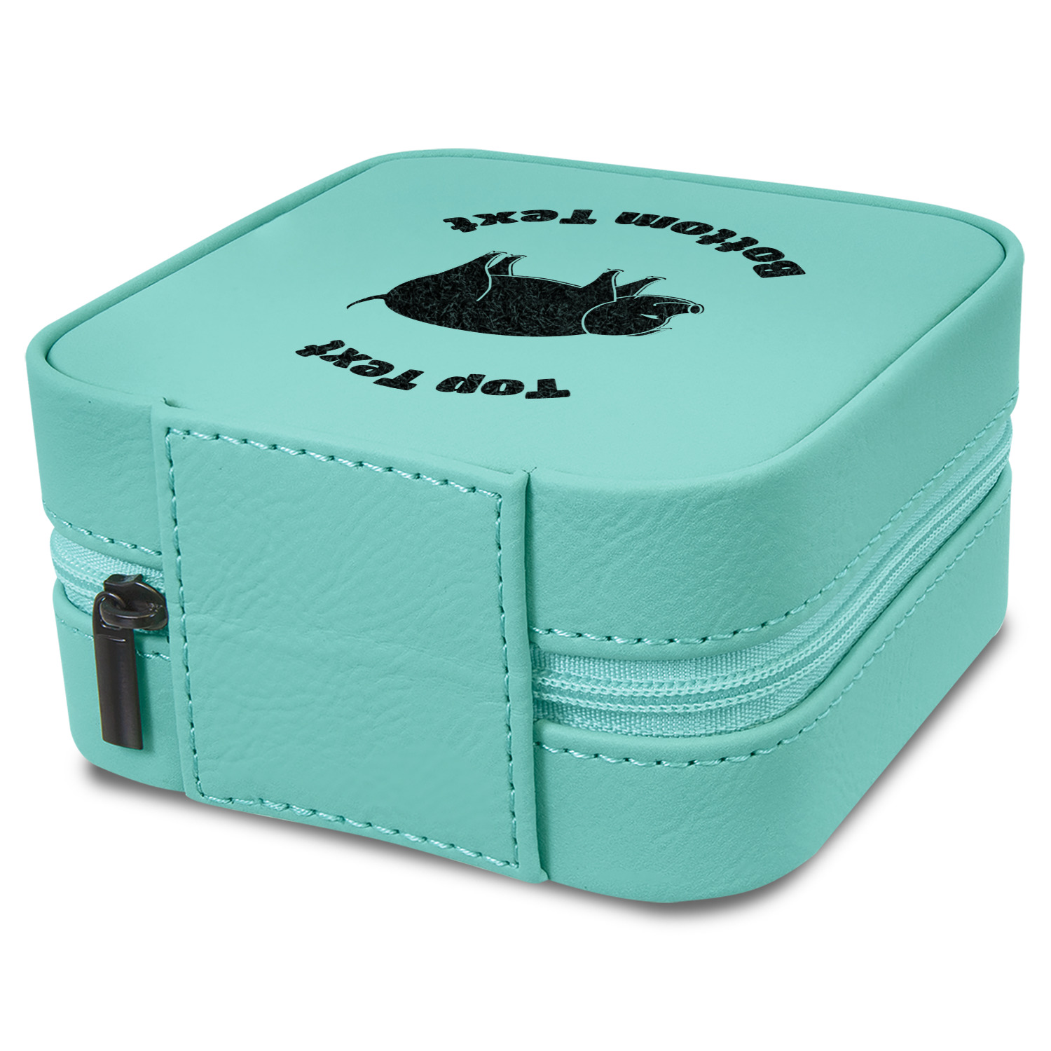 This square zippered travel jewelry box is made from leatherette and is available in four colors - classic cognac / rawhide, a beautiful teal. navy blue or pink. The tan colored soft velvet inside has compartments and hooks for all your jewelry - rings, chains, earrings, bangles etc.