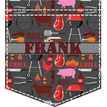 This design features pigs, cows, grills, and more on a simple grey background. There are wonderful contrasting reds, oranges, and charcoals in this manly design. The ribbon across the middle fits your personalization right in the middle.