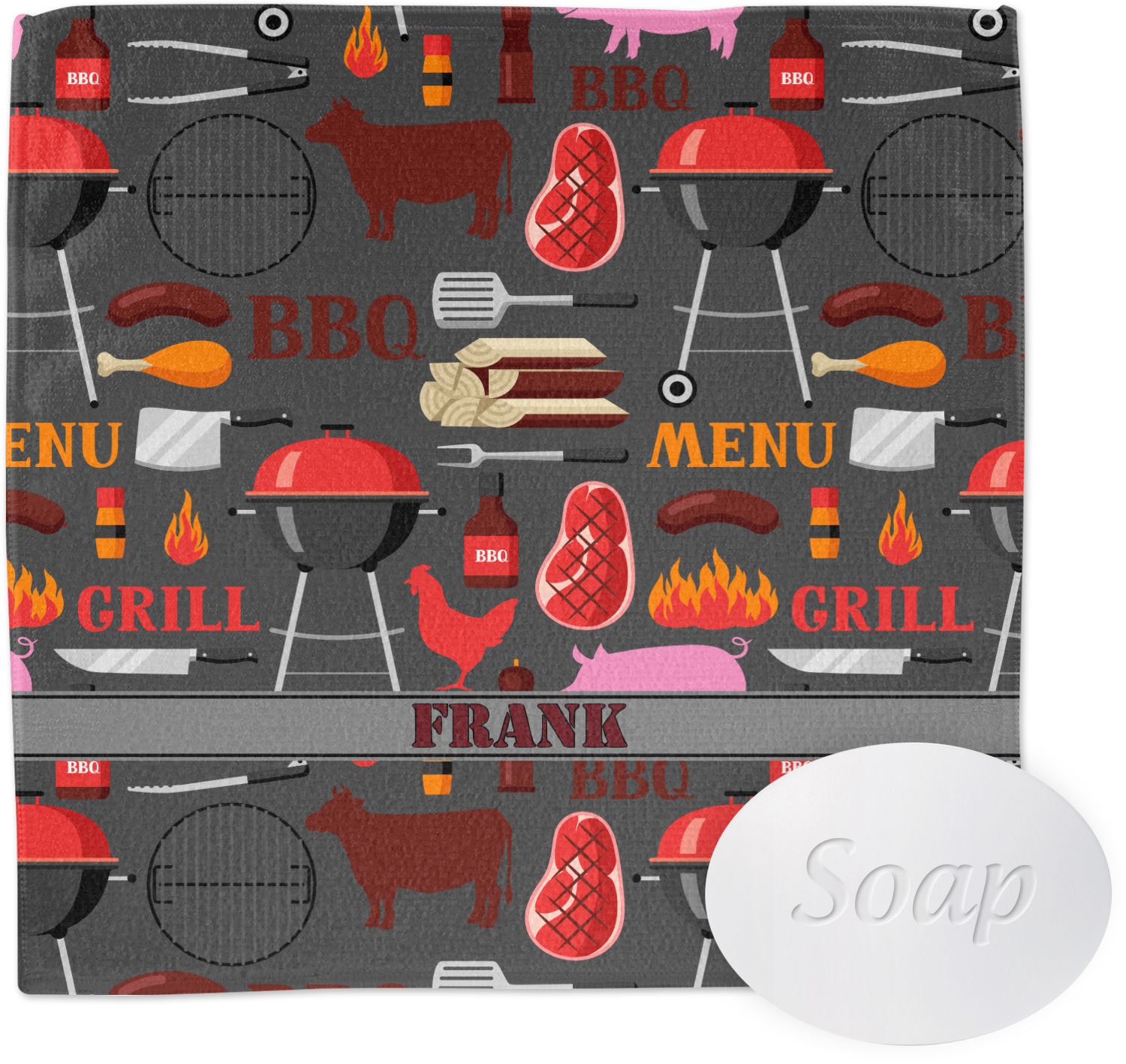 This design features pigs, cows, grills, and more on a simple grey background. There are wonderful contrasting reds, oranges, and charcoals in this manly design. The ribbon across the middle fits your personalization right in the middle.