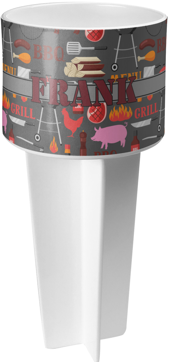 This cup holder has a large stake at its bottom that anchors it to the sand or ground below, while the cup holder rests above the stake. The entire drink holder is made of durable plastic and displays your customization around the cup holder portion. We sell these personalized beach spikers in two different colors: black and white.