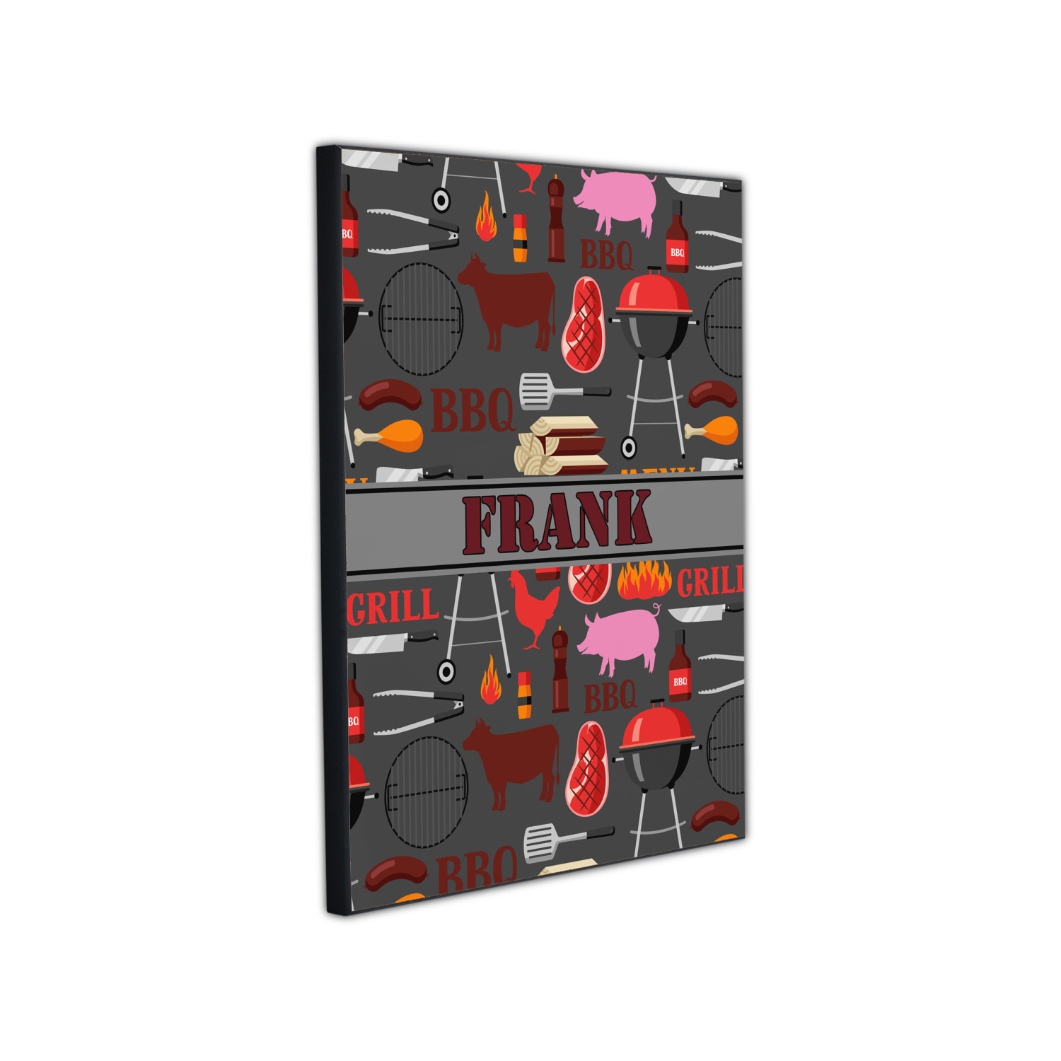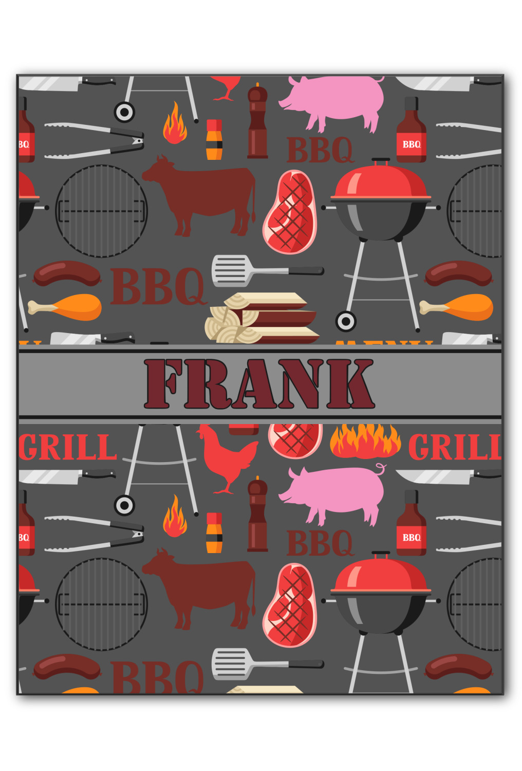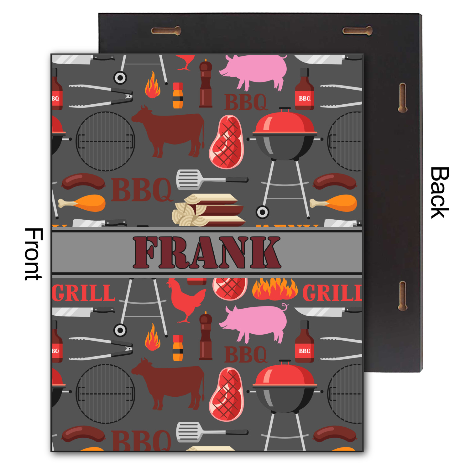 This design features pigs, cows, grills, and more on a simple grey background. There are wonderful contrasting reds, oranges, and charcoals in this manly design. The ribbon across the middle fits your personalization right in the middle.