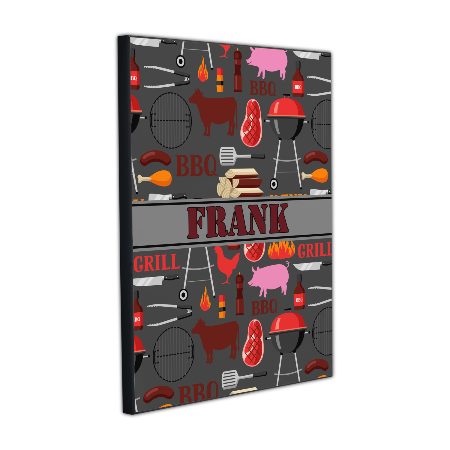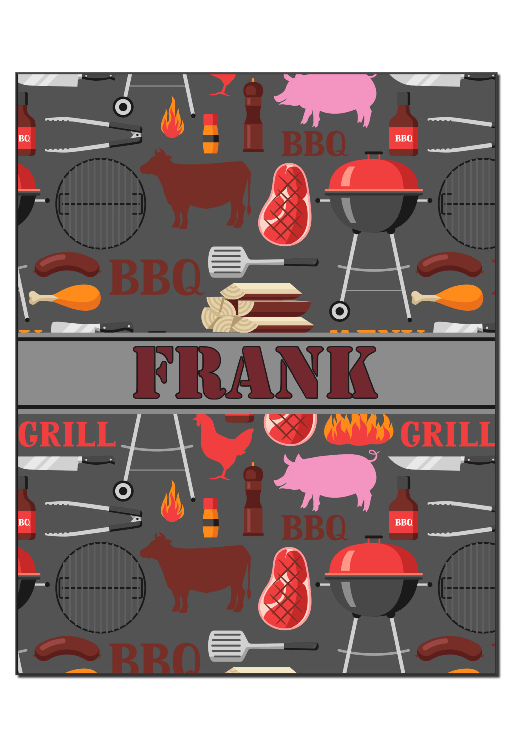 This design features pigs, cows, grills, and more on a simple grey background. There are wonderful contrasting reds, oranges, and charcoals in this manly design. The ribbon across the middle fits your personalization right in the middle.