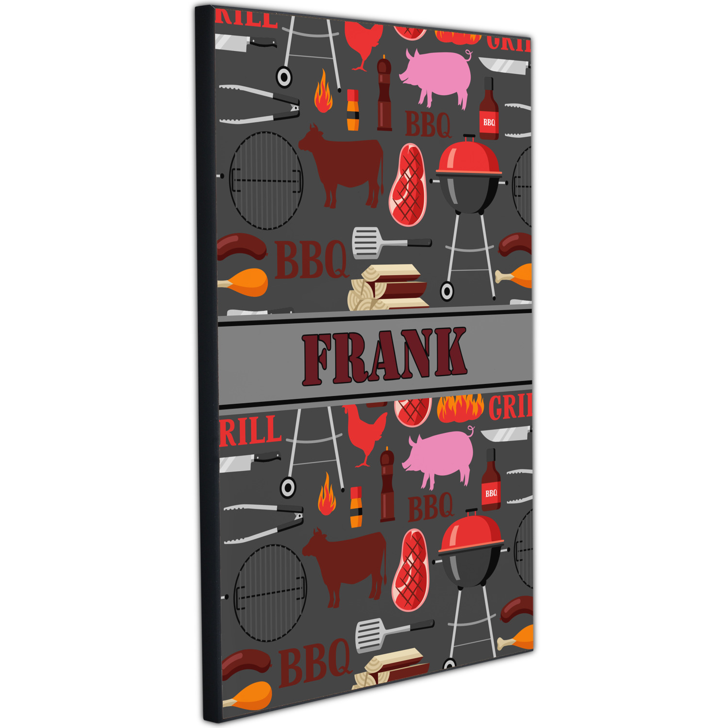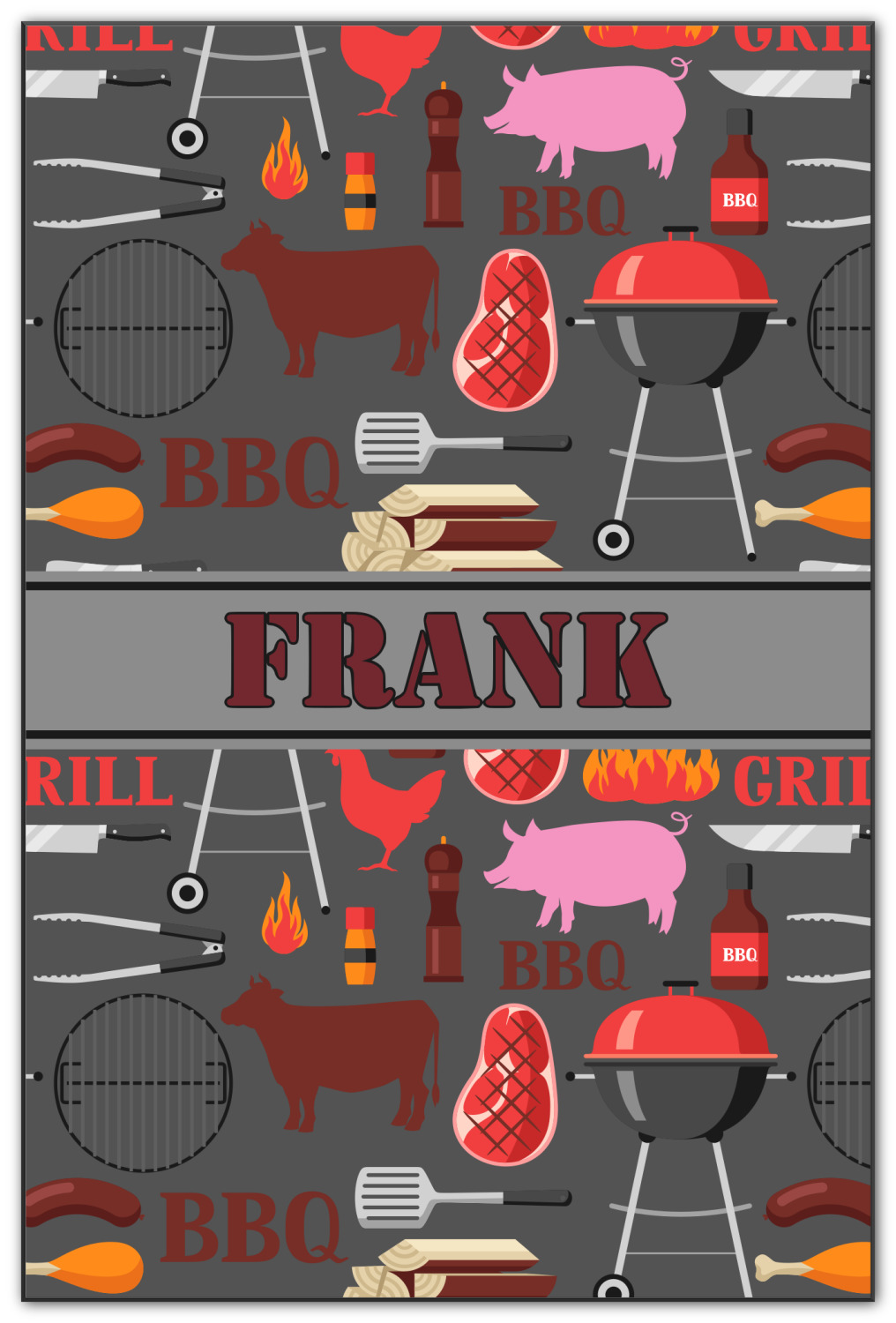 This design features pigs, cows, grills, and more on a simple grey background. There are wonderful contrasting reds, oranges, and charcoals in this manly design. The ribbon across the middle fits your personalization right in the middle.