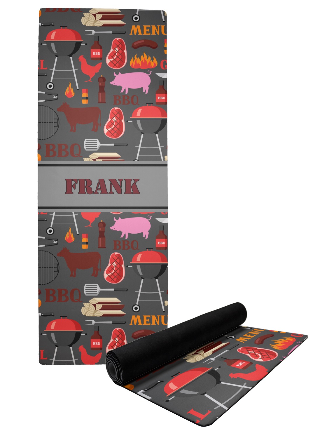 This design features pigs, cows, grills, and more on a simple grey background. There are wonderful contrasting reds, oranges, and charcoals in this manly design. The ribbon across the middle fits your personalization right in the middle.
