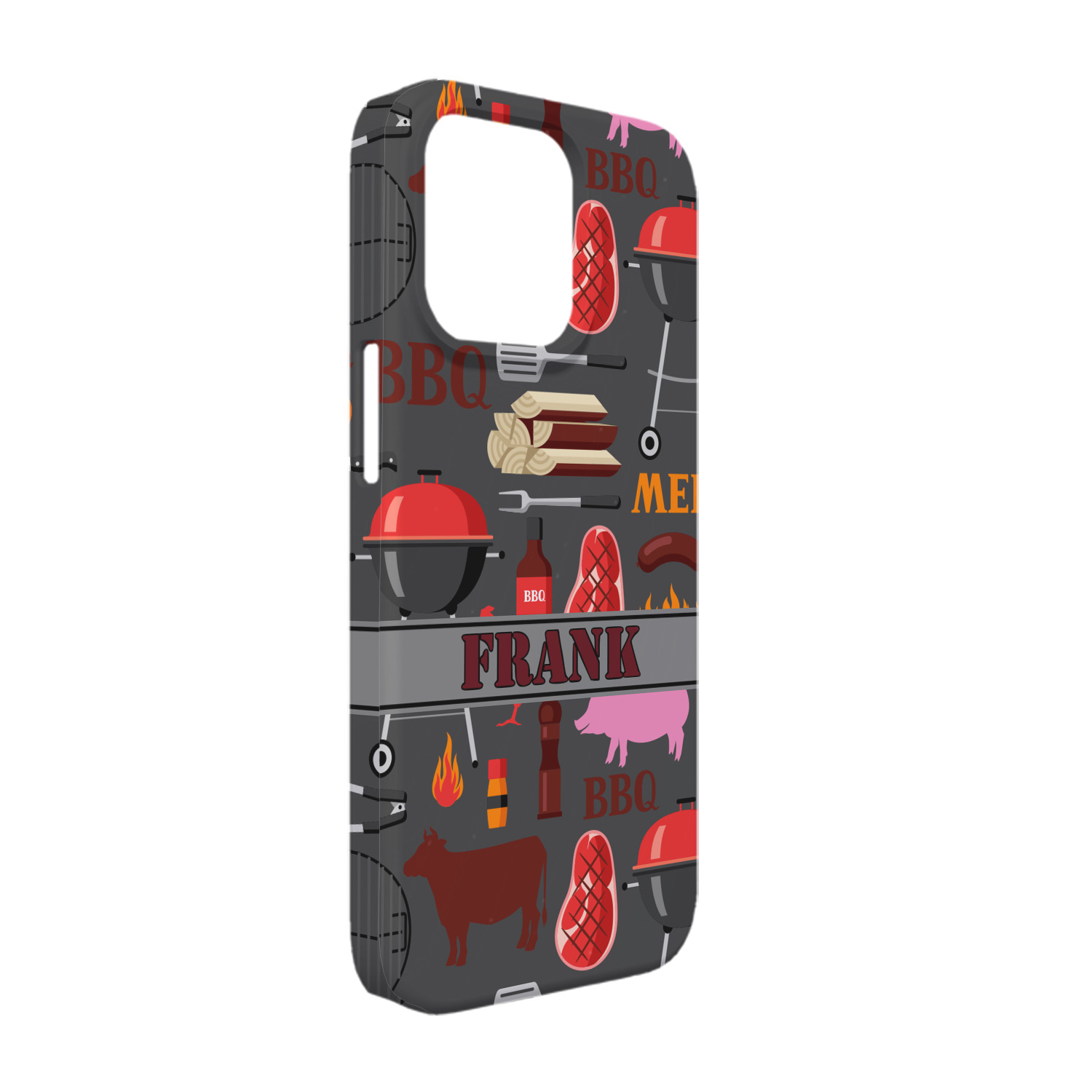 This design features pigs, cows, grills, and more on a simple grey background. There are wonderful contrasting reds, oranges, and charcoals in this manly design. The ribbon across the middle fits your personalization right in the middle.