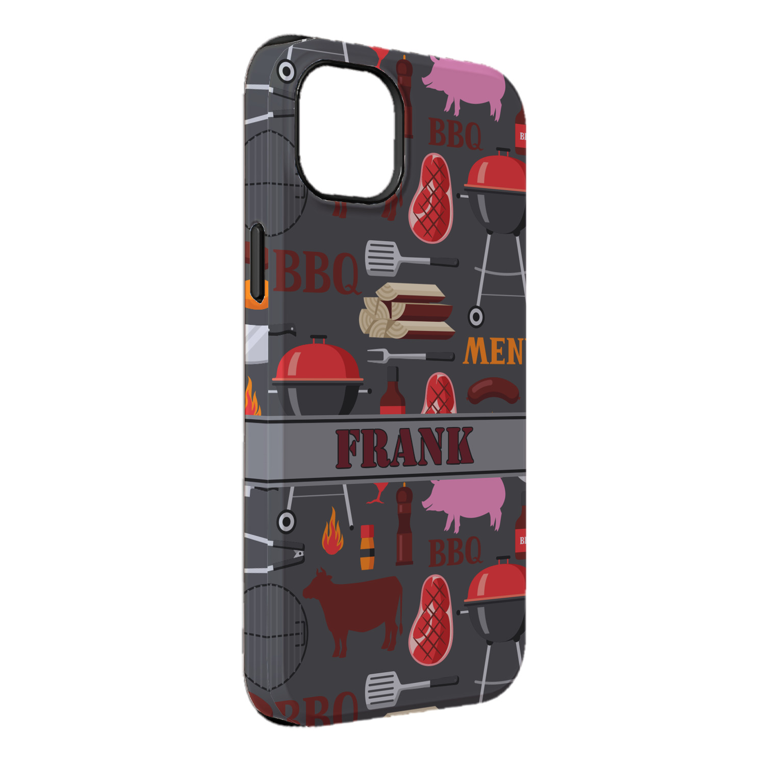This design features pigs, cows, grills, and more on a simple grey background. There are wonderful contrasting reds, oranges, and charcoals in this manly design. The ribbon across the middle fits your personalization right in the middle.