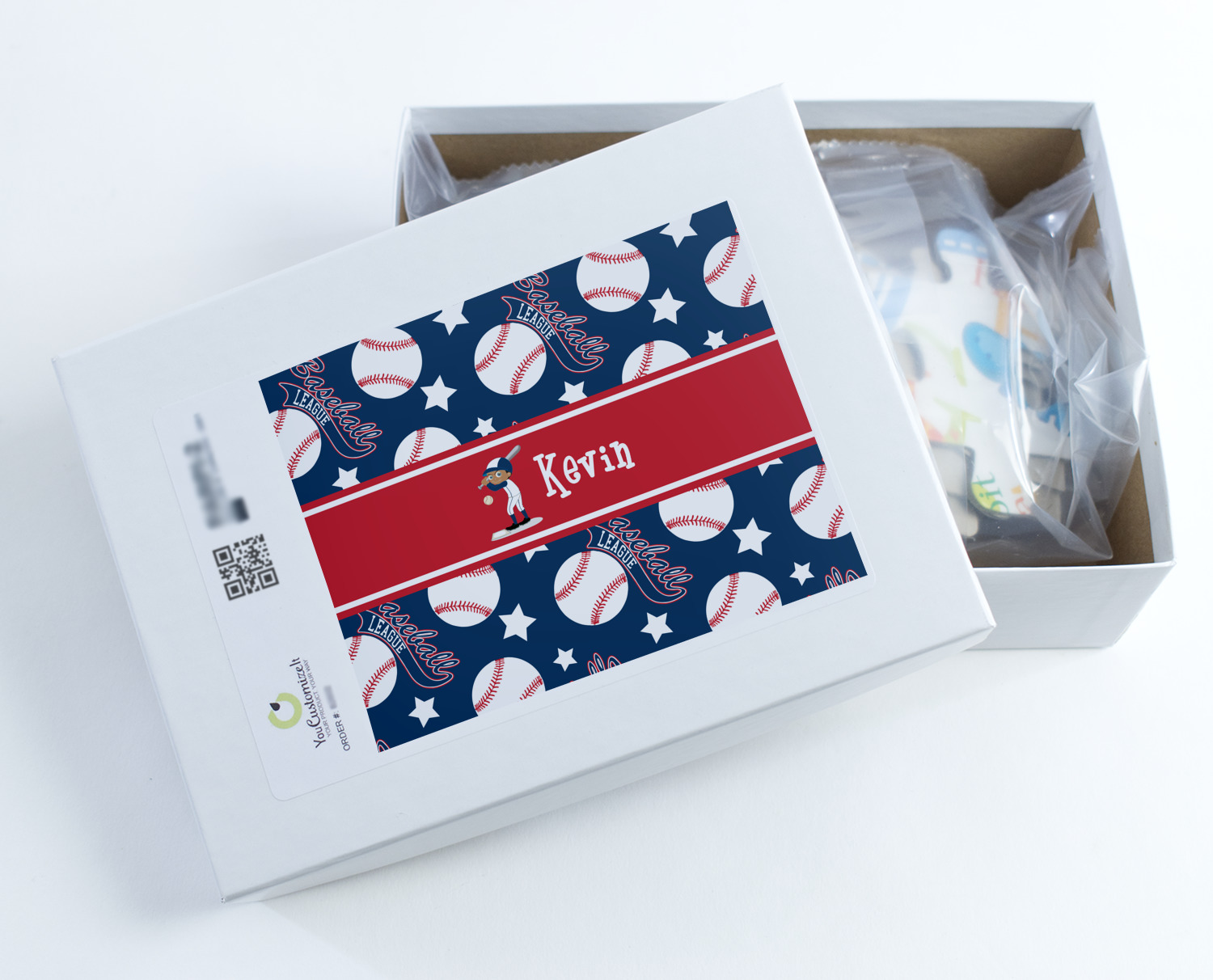 This baseball design is sure to please any baseball fan. The background in classic blue, with baseballs, baseball league banner and stars in red & white make this a classic color scheme for any boy. We have chosen to customize it with a red ribbon and have added a baseball player with his name as the personalization. The uniform on the baseball can be customized to his team colors. You can also customize his hair, skin and eye color as well.