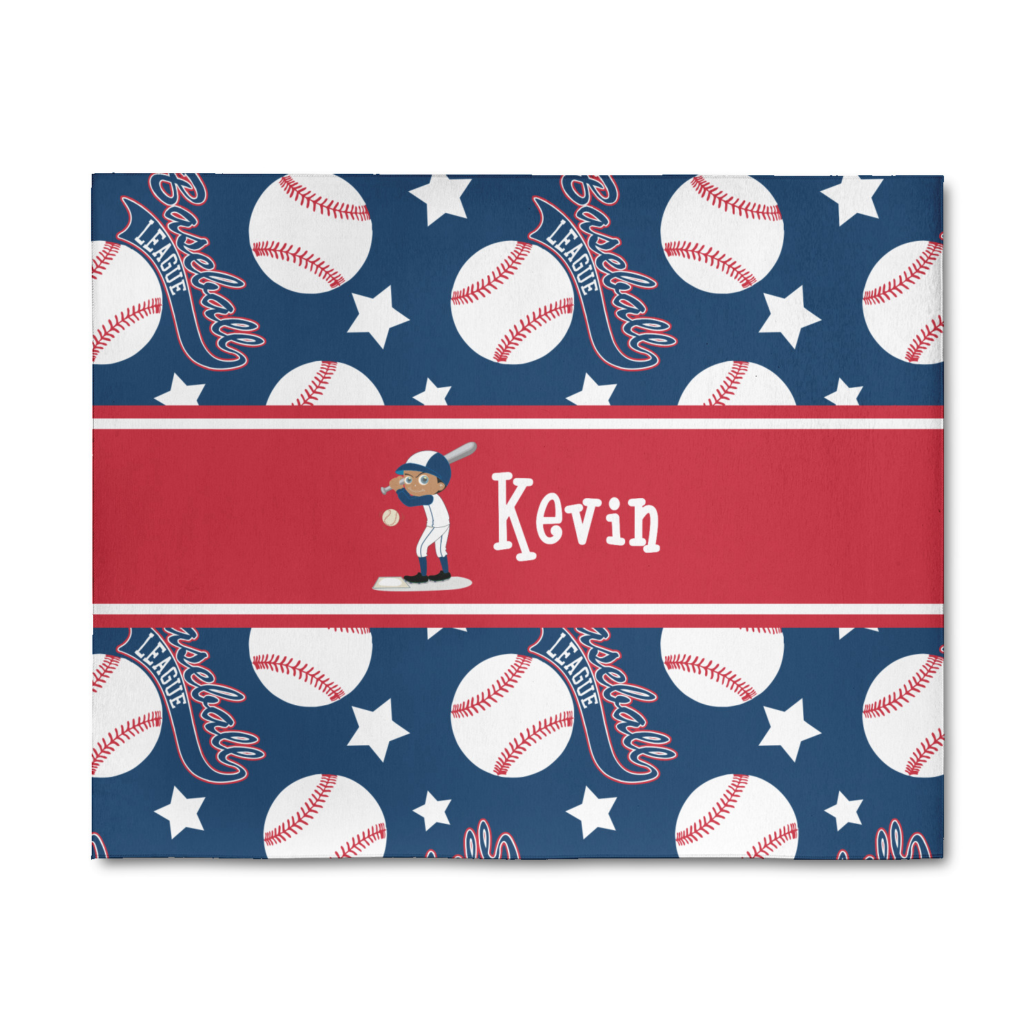 This baseball design is sure to please any baseball fan. The background in classic blue, with baseballs, baseball league banner and stars in red & white make this a classic color scheme for any boy. We have chosen to customize it with a red ribbon and have added a baseball player with his name as the personalization. The uniform on the baseball can be customized to his team colors. You can also customize his hair, skin and eye color as well.
