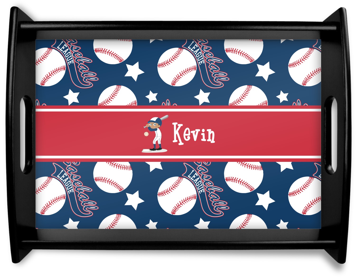 This serving tray with handles features square edges and two rounded sides, creating a very modern look. Each side is fabricated from a beautifully cut, natural wood. The bottom of the interior of the tray displays your customized design in bright, vibrant color. The tray is sold in both a black color and a natural wood look. Each variation of the wood serving tray has two sizes: Small, which is 14" x 10" x 2.25", and Large, which is 19.5" x 13.5" x 2.75".