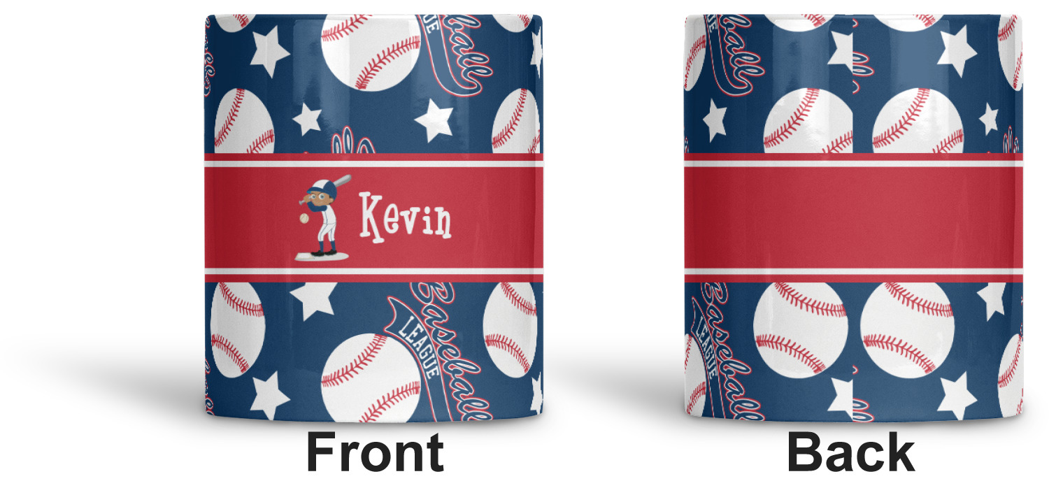 This baseball design is sure to please any baseball fan. The background in classic blue, with baseballs, baseball league banner and stars in red & white make this a classic color scheme for any boy. We have chosen to customize it with a red ribbon and have added a baseball player with his name as the personalization. The uniform on the baseball can be customized to his team colors. You can also customize his hair, skin and eye color as well.