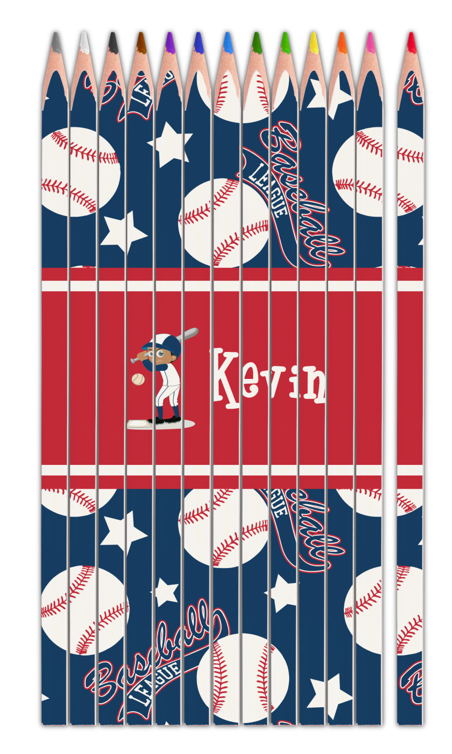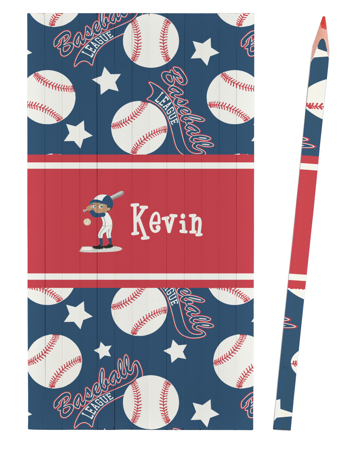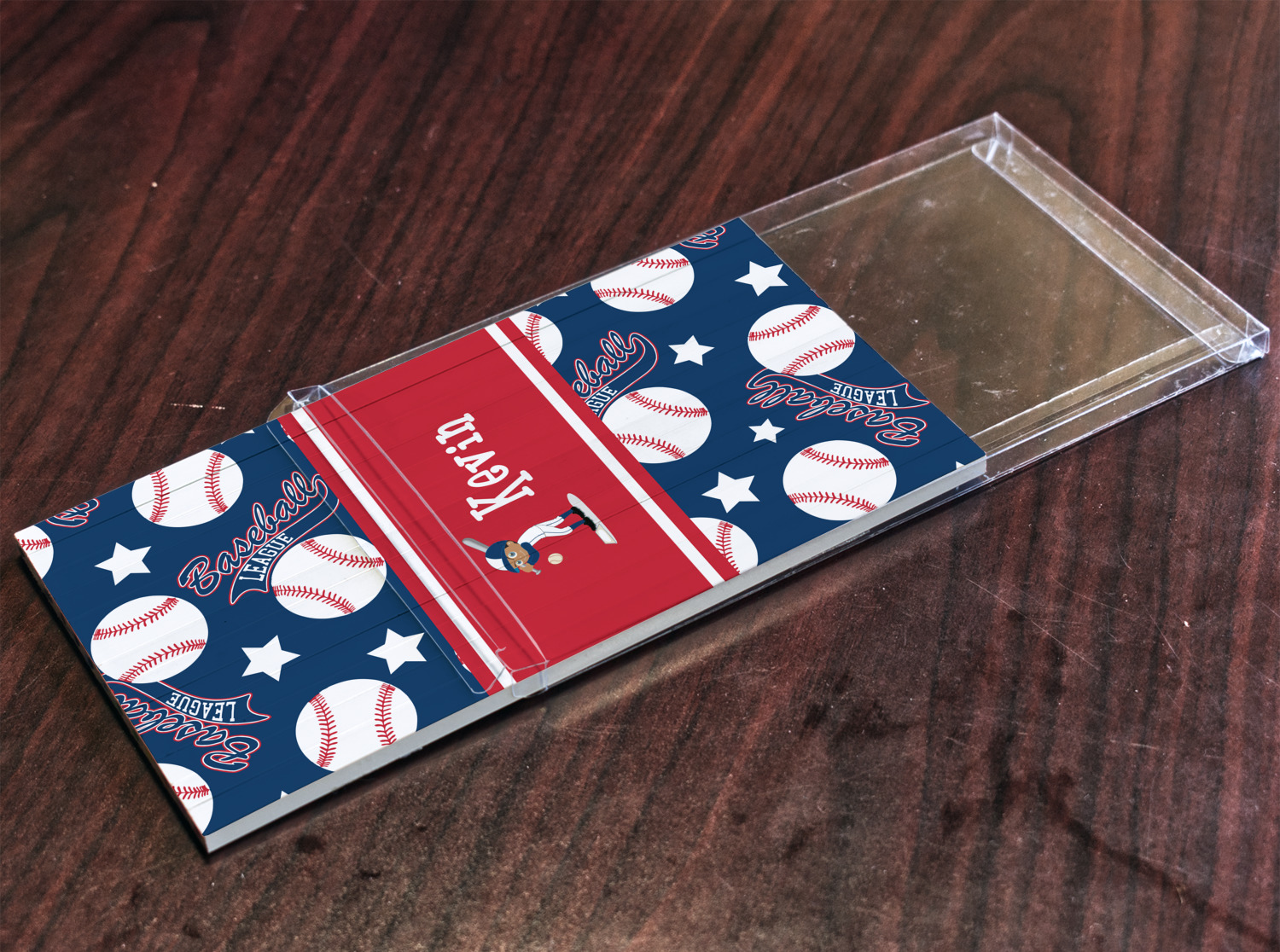This baseball design is sure to please any baseball fan. The background in classic blue, with baseballs, baseball league banner and stars in red & white make this a classic color scheme for any boy. We have chosen to customize it with a red ribbon and have added a baseball player with his name as the personalization. The uniform on the baseball can be customized to his team colors. You can also customize his hair, skin and eye color as well.