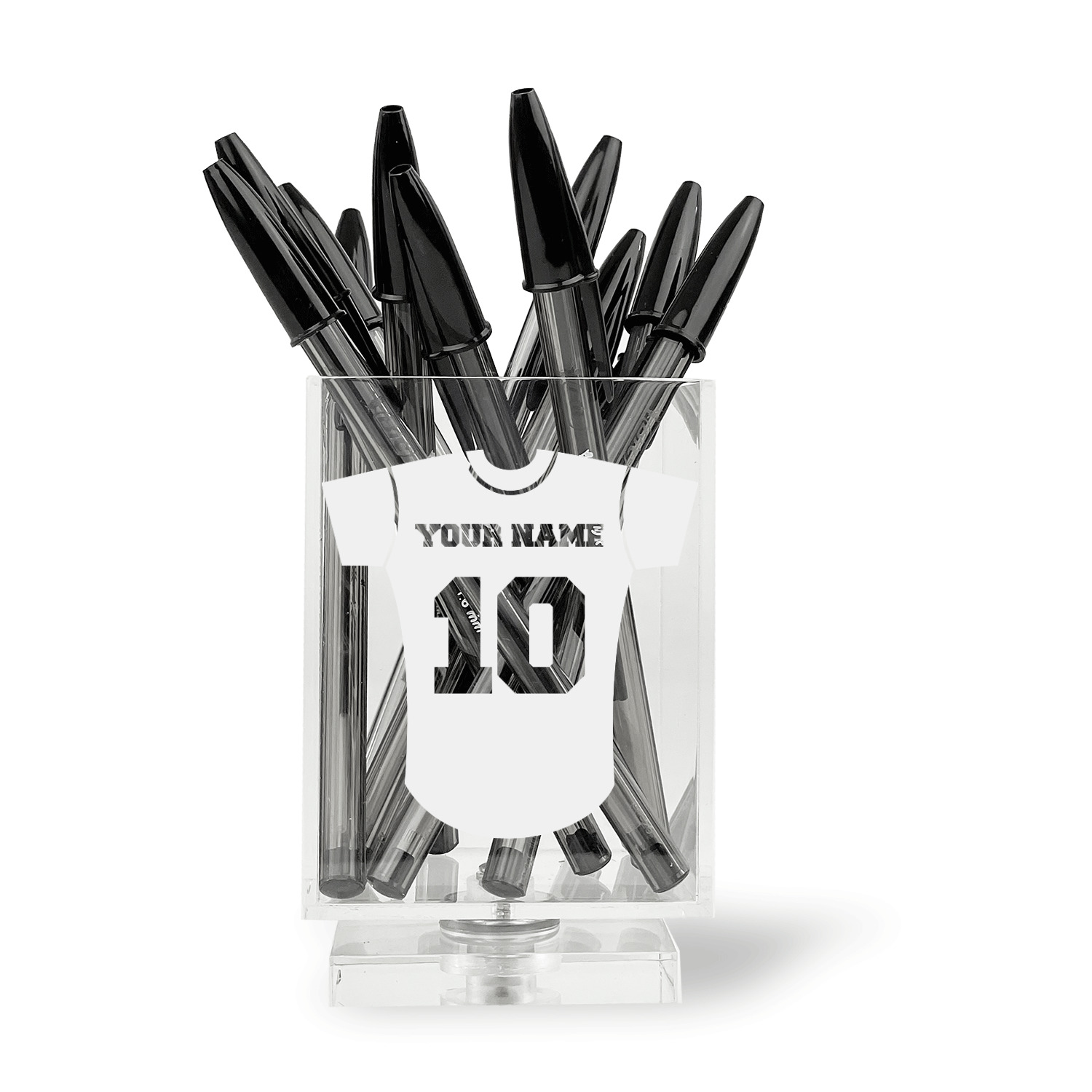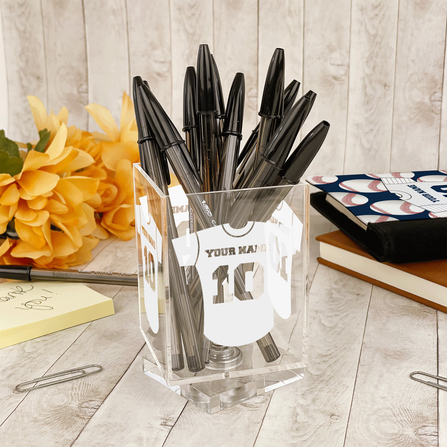 Add a great accessory to your desk with one of these acrylic pen holders. A great way to store your writing utensils, and personalized to suit your needs.