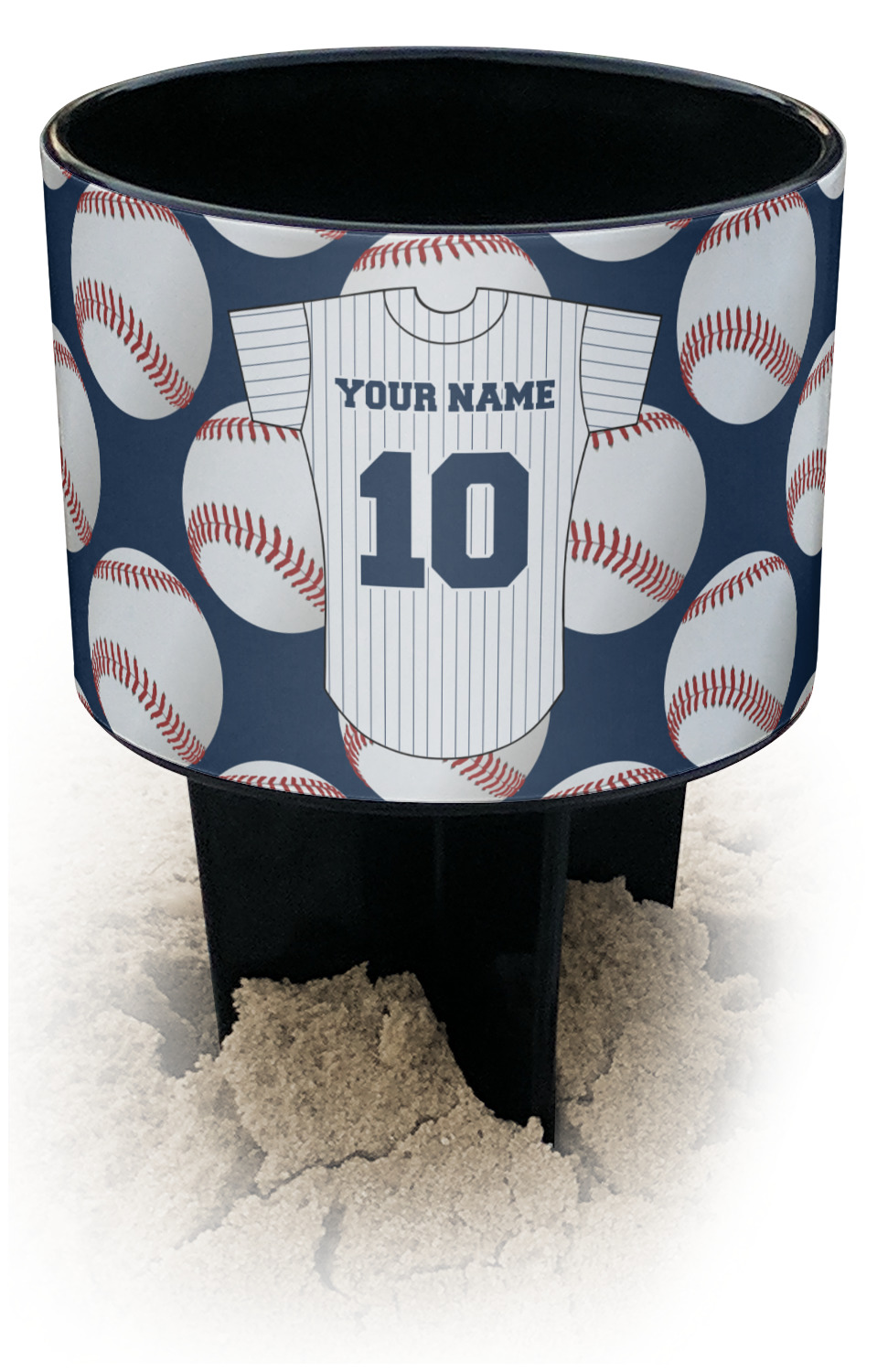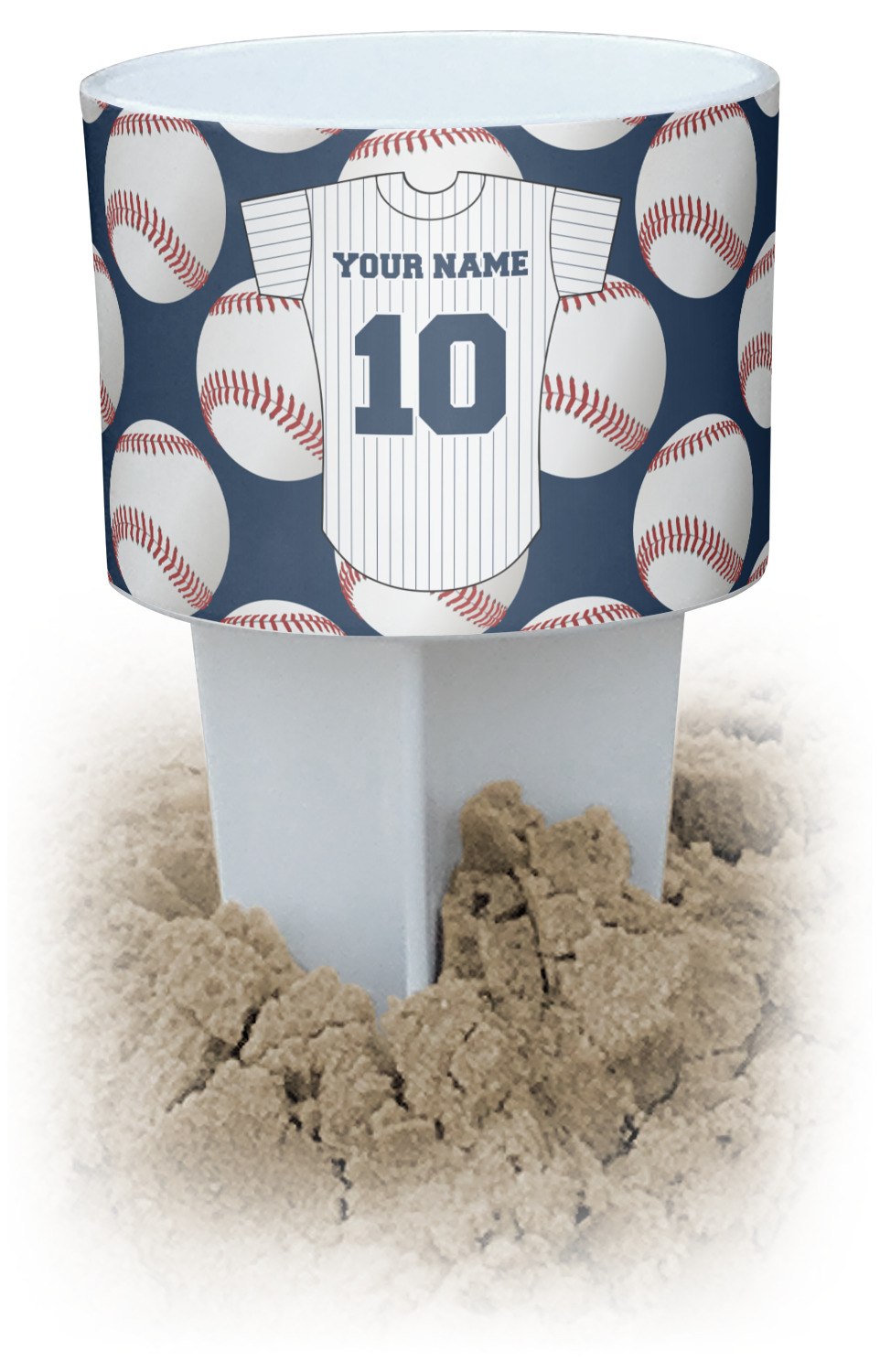 This cup holder has a large stake at its bottom that anchors it to the sand or ground below, while the cup holder rests above the stake. The entire drink holder is made of durable plastic and displays your customization around the cup holder portion. We sell these personalized beach spikers in two different colors: black and white.