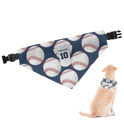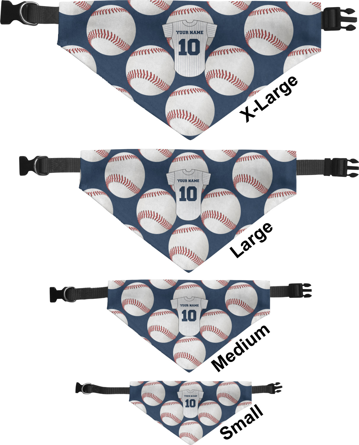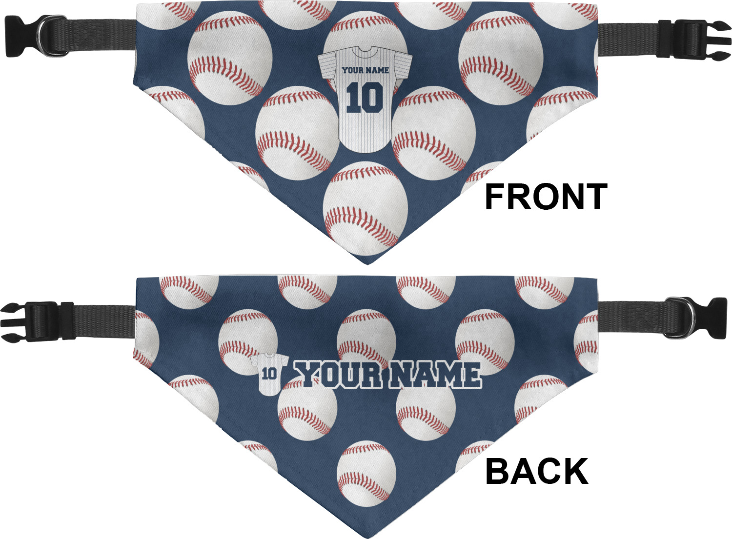 We print the front and back of these dog bandanas with your customized design. The bandana itself is made from a durable polyester, sewn together with a gap large enough to accommodate any collar. Regardless, the bandana includes a plain black, canvas collar with plastic snaps, that can easily be removed if desired. These dog bandana collars are available in four sizes: small, medium, large, and extra large. Please see our sizing chart for more information regarding the dimensions of each size.